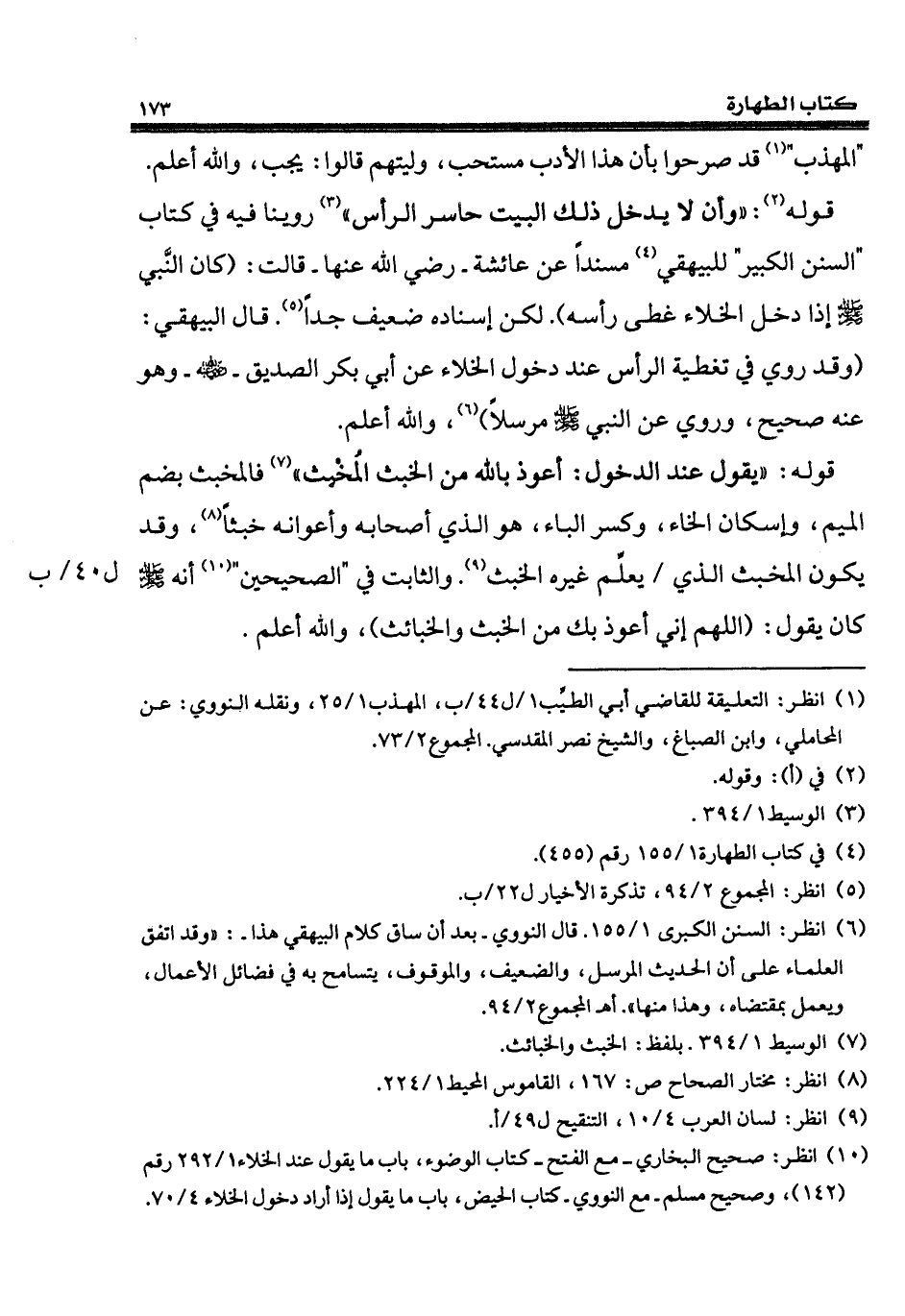 (¬10) انظر: صحيح البخاري - مع الفتح - كتاب الوضوء، باب ما يقول عند الخلاء 1/ 292 رقم (142)، وصحيح مسلم - مع النووي - كتاب الحيض، باب ما يقول إذا أراد دخول الخلاء 4/ 70.