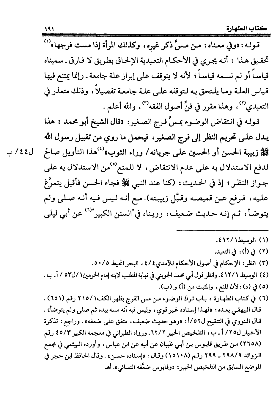 (¬6) في كتاب الطهارة، باب ترك الوضوء من مس الفرج بظهر الكف 1/ 215 رقم (651). قال البيهقي بعده: "فهذا إسناده غير قوي، وليس فيه أنه مسه بيده ثم صلى ولم يتوضأ". قال النووي في التنقيح ل 52/ أ: "وهو حديث ضعيف، متفق على ضعفه". وراجع: تذكرة الأخيار ل 25/ أ - ب، التلخيص الحبير 2/ 62. ورواه الطبراني في معجمه الكبير 3/ 45 رقم (2658) من طريق قابوس بن أبي ظبيان عن أبيه عن ابن عباس، وأورده الهيثمي في مجمع الزوائد 9/ 298 - 299 رقم (15108) وقال: "إسناده حسن". وقال الحافظ ابن حجر في الموضع السابق من التلخيص الحبير: "وقابوس ضعَّفه النسائي". أهـ
