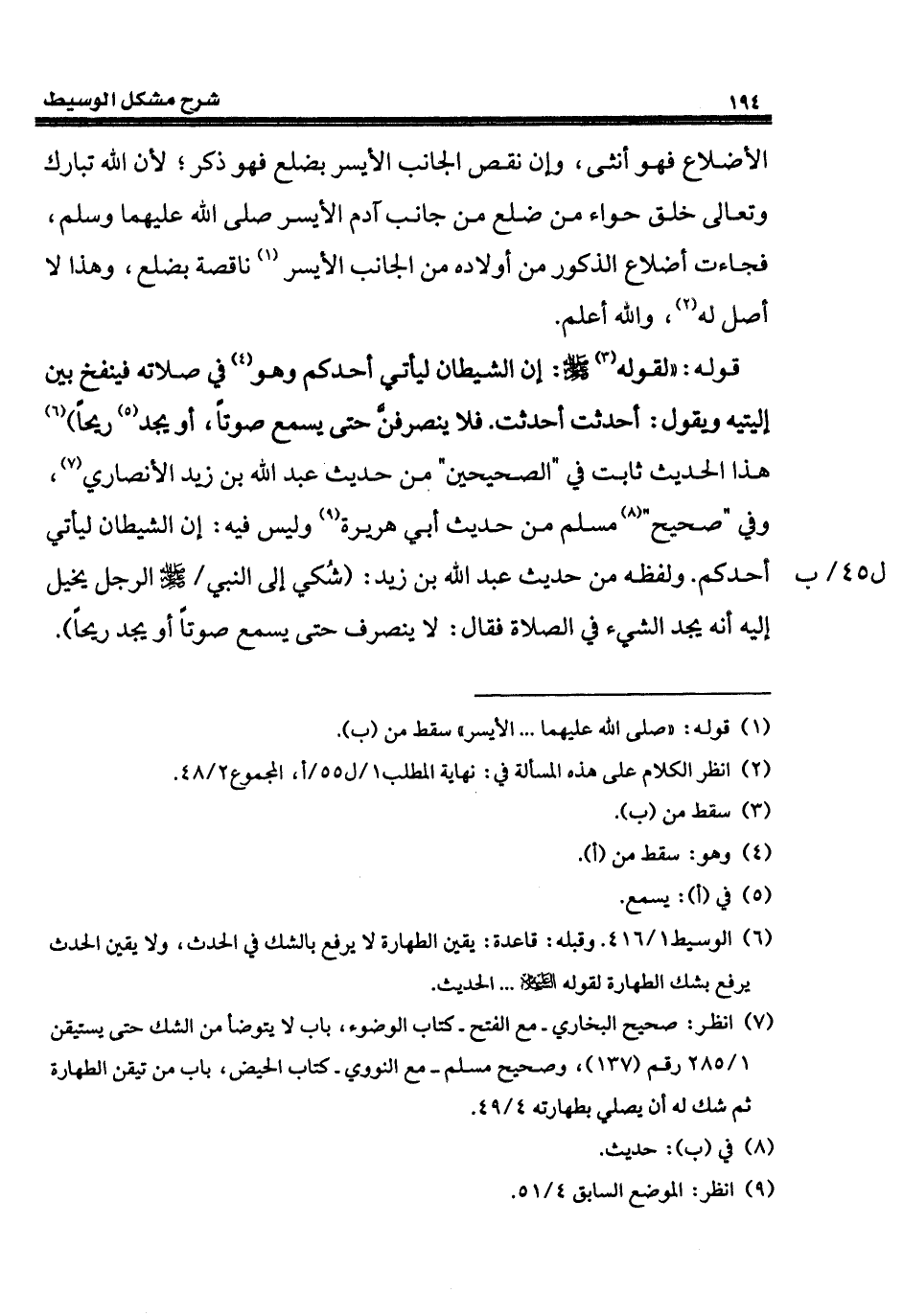 قوله: "لقوله (¬3) - صلى الله عليه وسلم -: إن الشيطان ليأتي أحدكم وهو (¬4) في صلاته فينفخ بين إليتيه ويقول: أحدثت أحدثت. فلا ينصرفنَّ حتى يسمع صوتاً، أو يجد (¬5) ريحاً) (¬6) هذا الحديث ثابت في "الصحيحين" من حديث عبد الله بن زيد الأنصاري (¬7)، وفي "صحيح" (¬8) مسلم من حديث أبي هريرة (¬9) وليس فيه: إن الشيطان ليأتي أحدكم. ولفظه من حديث عبد الله بن زيد: (شُكي إلى النبي - صلى الله عليه وسلم - الرجل يخيل إليه أنه يجد الشيء في الصلاة فقال: لا ينصرف حتى يسمع صوتاً أو يجد ريحاً).