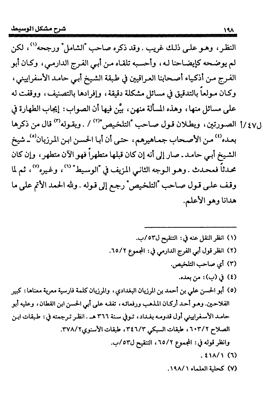 النظر، وهو على ذلك غريب. وقد ذكره صاحب "الشامل" ورجحه (¬1)، لكن لم يوضحه كإيضاحنا له، وأحسبه تلقاه من أبي الفرج الدارمي، وكان أبو الفرج من أذكياء أصحابنا العراقيين في طبقة الشيخ أبي حامد الأسفراييني، وكان مولعاً بالتدقيق في مسائل مشكلة دقيقة، وإفرادها بالتصنيف، ووقفت له على مسائل منها، وهذه المسألة منهن، بيَّن فيها أن الصواب: إيجاب الطهارة في الصورتين، وبطلان قول صاحب "التلخيص" (¬2). وبقوله (¬3) قال من ذكرها بعده (¬4) من الأصحاب جماهيرهم، حتى أن أبا الحسن ابن المرزبان (¬5) - شيخ الشيخ أبي حامد - صار إلى أنه إن كان قبلها متطهراً فهو الآن متطهر، وإن كان محدثاً فمحدث. وهو الوجه الثاني المزيف في "الوسيط" (¬6)، وغيره (¬7)، ثم لما وقف على قول صاحب "التلخيص" رجع إلى قوله. ولله الحمد الأتم على ما هدانا وهو الأعلم.