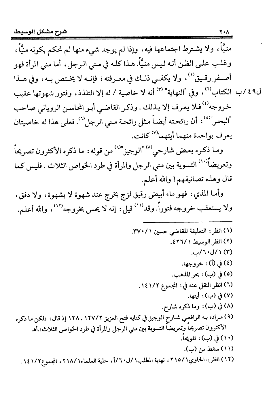 (¬9) مراده به الرافعي شارح الوجيز في كتابه فتح العزيز 2/ 127 - 128 إذ قال: "لكن ما ذكره الأكثرون تصريحاً وتعريضاً التسوية بين مني الرجل والمرأة في طرد الخواص الثلاث". أهـ