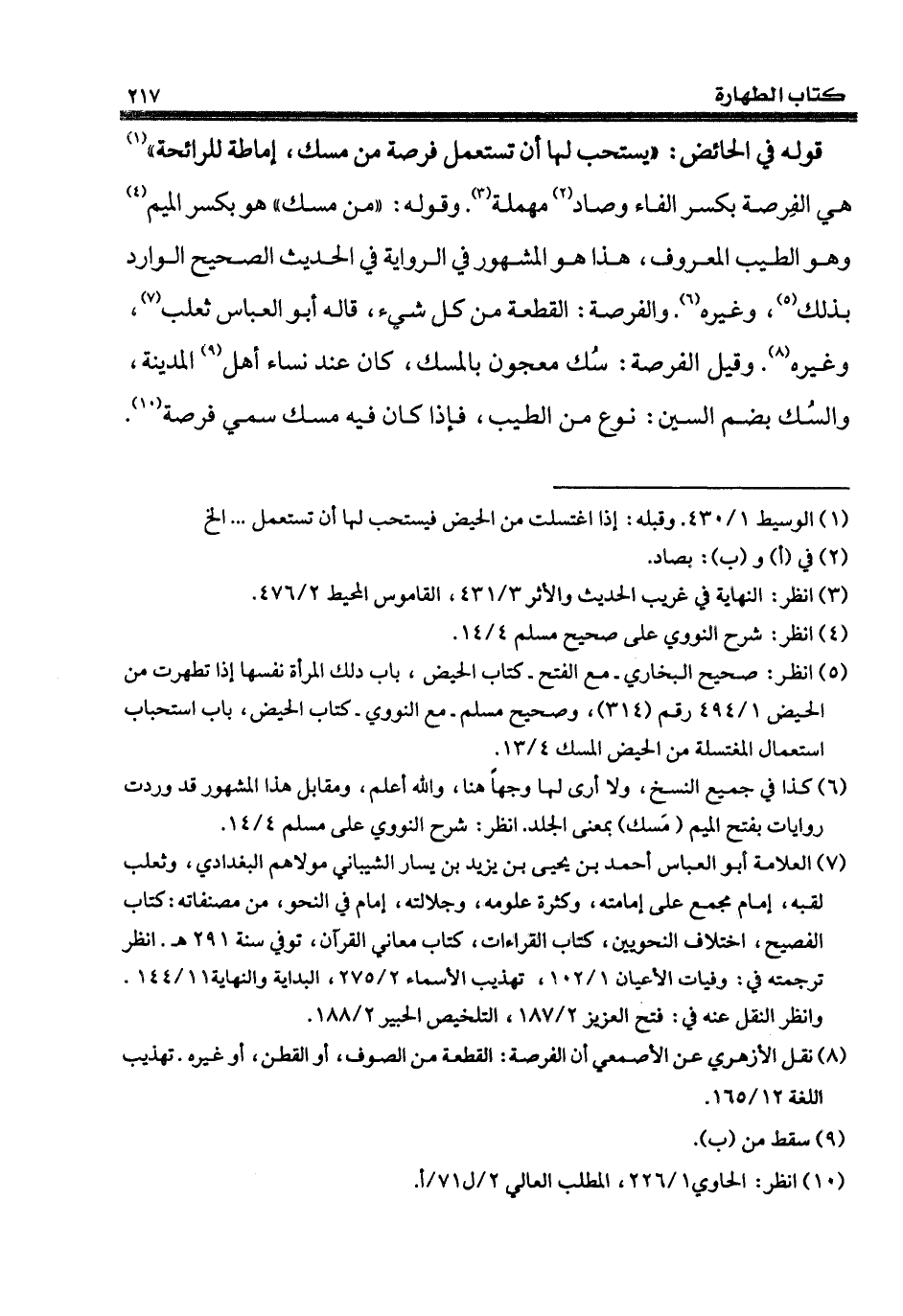 (¬5) انظر: صحيح البخاري - مع الفتح - كتاب الحيض، باب دلك المرأة نفسها إذا تطهرت من الحيض 1/ 494 رقم (314)، وصحيح مسلم - مع النووي - كتاب الحيض، باب استحباب استعمال المغتسلة من الحيض المسك 4/ 13.