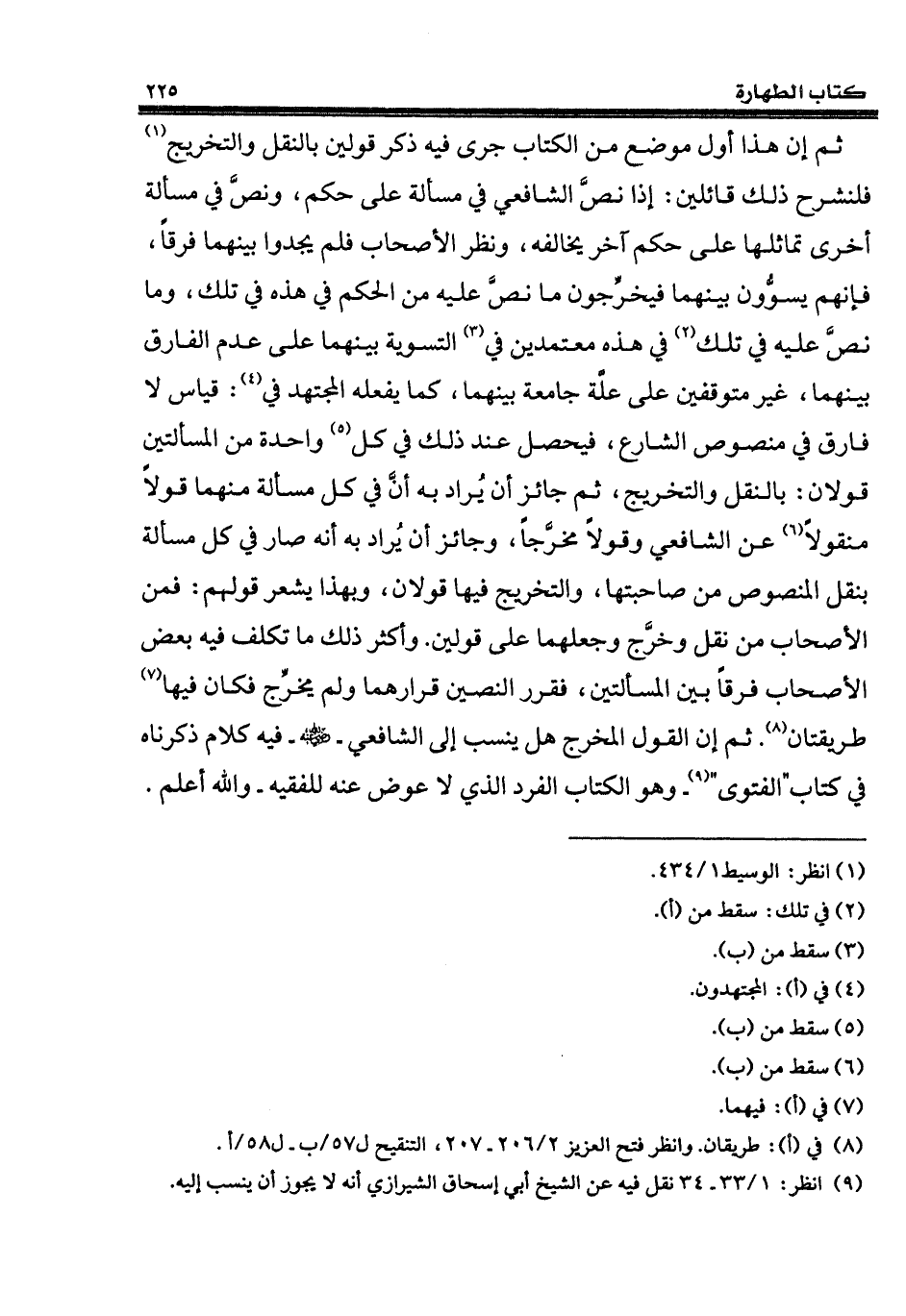 ثم إن هذا أول موضع من الكتاب جرى فيه ذكر قولين بالنقل والتخريج (¬1) فلنشرح ذلك قائلين: إذا نصَّ الشافعي في مسألة على حكم، ونصَّ في مسألة أخرى تماثلها على حكم آخر يخالفه، ونظر الأصحاب فلم يجدوا بينهما فرقاً، فإنهم يسوُّون بينهما فيخرِّجون ما نصَّ عليه من الحكم في هذه في تلك، وما نصَّ عليه في تلك (¬2) في هذه معتمدين في (¬3) التسوية بينهما على عدم الفارق بينهما، غيرمتوقفين على علَّة جامعة بينهما، كما يفعله المجتهد في (¬4): قياس لا فارق في منصوص الشارع، فيحصل عند ذلك في كل (¬5) واحدة من المسألتين قولان: بالنقل والتخريج، ثم جائز أن يُراد به أنَّ في كل مسألة منهما قولاً منقولاً (¬6) عن الشافعي وقولاً مخرَّجاً، وجائز أن يُراد به أنه صار في كل مسألة بنقل المنصوص من صاحبتها، والتخريج فيها قولان، وبهذا يشعر قولهم: فمن الأصحاب من نقل وخرَّج وجعلهما على قولين. وأكثر ذلك ما تكلف فيه بعض الأصحاب فرقاً بين المسألتين، فقرر النصين قرارهما ولم يخرِّج فكان فيها (¬7) طريقتان (¬8). ثم إن القول المخرج هل ينسب إلى الشافعي - رضي الله عنه - فيه كلام ذكرناه في كتاب "الفتوى" (¬9) - وهو الكتاب الفرد الذي لا عوض عنه للفقيه - والله أعلم.