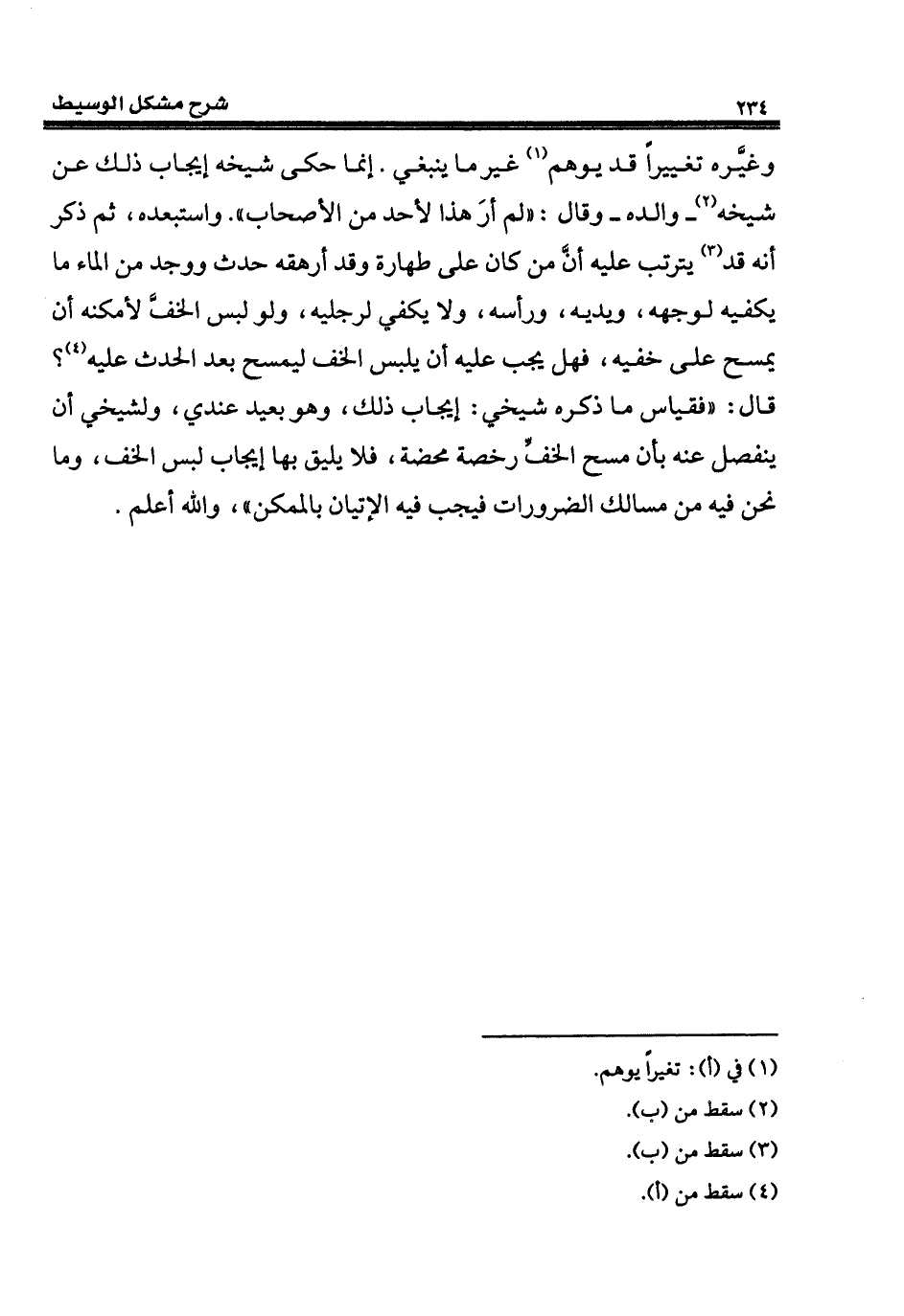 وغيَّره تغييراً قد يوهم (¬1) غير ما ينبغي. إنما حكى شيخه إيجاب ذلك عن شيخه (¬2) - والده - وقال: "لم أرَ هذا لأحد من الأصحاب". واستبعده، ثم ذكر أنه قد (¬3) يترتب عليه أنَّ من كان على طهارة وقد أرهقه حدث ووجد من الماء ما يكفيه لوجهه، ويديه، ورأسه، ولا يكفي لرجليه، ولو لبس الخفَّ لأمكنه أن يمسح على خفيه، فهل يجب عليه أن يلبس الخف ليمسح بعد الحدث عليه (¬4)؟ قال: "فقياس ما ذكره شيخي: إيجاب ذلك، وهو بعيد عندي، ولشيخي أن ينفصل عنه بأن مسح الخفَّ رخصة محضة، فلا يليق بها إيجاب لبس الخف، وما نحن فيه من مسالك الضرورات فيجب فيه الإتيان بالممكن"، والله أعلم.