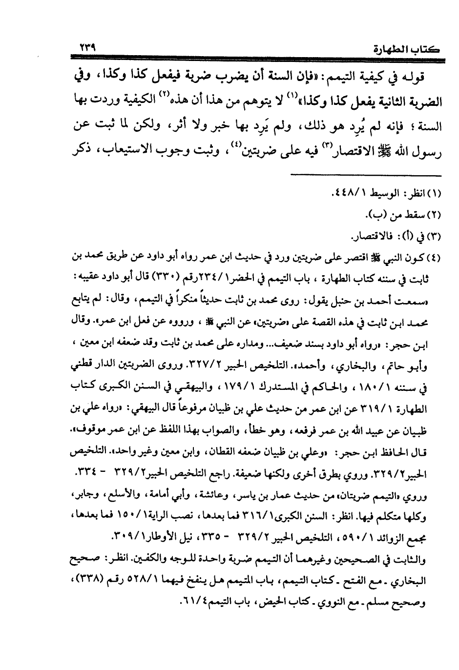 (¬4) كون النبي - صلى الله عليه وسلم - اقتصر على ضربتين ورد في حديث ابن عمر رواه أبو داود عن طريق محمَّد بن ثابت في سننه كتاب الطهارة، باب التيمم في الحضر 1/ 234 رقم (330) قال أبو داود عقيبه: "سمعت أحمد بن حنبل يقول: روى محمَّد بن ثابت حديثاً منكراً في التيمم، وقال: لم يتابع محمَّد ابن ثابت في هذه القصة على "ضربتين" عن النبي - صلى الله عليه وسلم -، ورووه عن فعل ابن عمر". وقال ابن حجر: "رواه أبو داود بسند ضعيف ... ومداره على محمَّد بن ثابت وقد ضعفه ابن معين، وأبو حاتم، والبخاري، وأحمد". التلخيص الحبير 2/ 327. وروى الضربتين الدارقطني في سننه 1/ 180، والحاكم في المستدرك 1/ 179، والبيهقي في السنن الكبرى كتاب الطهارة 1/ 319 عن ابن عمر من حديث علي بن ظبيان مرفوعاً قال البيهقي: "رواه علي بن ظبيان عن عبيد الله بن عمر فرفعه، وهو خطأ، والصواب بهذا اللفظ عن ابن عمر موقوف". قال الحافظ ابن حجر: "وعلي بن ظبيان ضعفه القطان، وابن معين وغير واحد". التلخيص الحبير 2/ 329. وروى بطرق أخرى ولكنها ضعيفة. راجع التلخيص الحبير 2/ 329 - 334. وروي "التيمم ضربتان" من حديث عمار بن ياسر، وعائشة، وأبي أمامة، والأسلع، وجابر، وكلها متكلم فيها. انظر: السنن الكبرى 1/ 316 فما بعدها، نصب الراية 1/ 150 فما بعدها، مجمع الزوائد 1/ 590، التلخيص الحبير 2/ 329 - 335، نيل الأوطار 1/ 309.