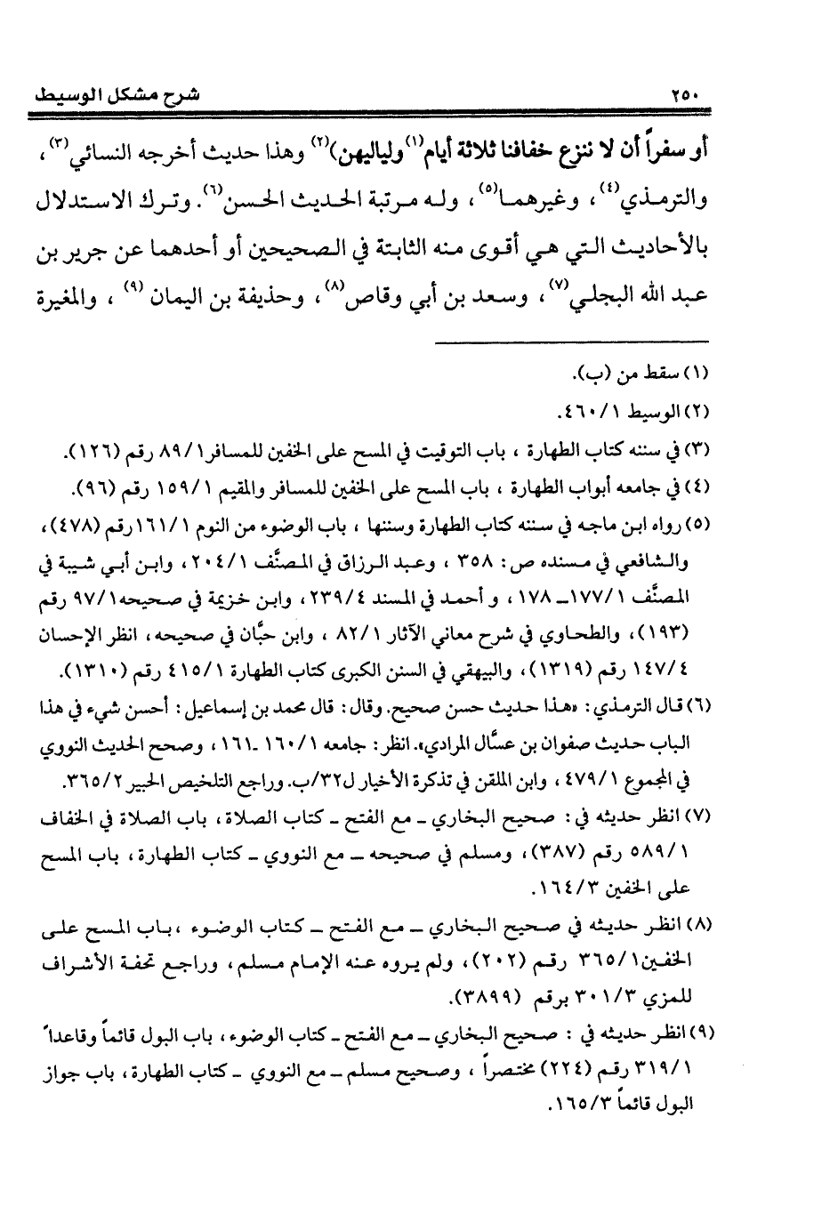 أو سفراً أن لا ننزع خفافنا ثلاثة أيام (¬1) ولياليهن) (¬2) وهذا حديث أخرجه النسائي (¬3)، والترمذي (¬4)، وغيرهما (¬5)، وله مرتبة الحديث الحسن (¬6). وترك الاستدلال بالأحاديث التي هي أقوى منه الثابتة في الصحيحين أو أحدهما عن جرير بن عبد الله البجلي (¬7)، وسعد بن أبي وقاص (¬8)، وحذيفة بن اليمان (¬9)، والمغيرة