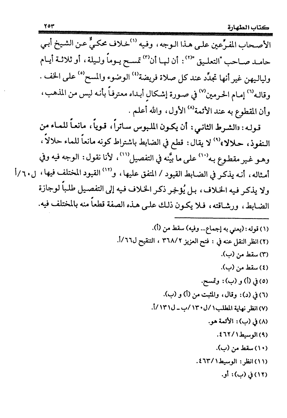 قوله: "الشرط الثاني: أن يكون الملبوس ساتراً، قوياً، مانعاً للماء من النفوذ، حلالا" (¬9) لا يقال: قطع في الضابط باشتراط كونه مانعاً للماء حلالاً، وهو غيرمقطوع به (¬10) على ما بيَّنه في التفصيل (¬11) , لأنا نقول: الوجه فيه وفي أمثاله، أنه يذكر في الضابط القيود المتفق عليها، و (¬12) القيود المختلف فيها، ولا يذكر فيه الخلاف، بل يُؤخِر ذكر الخلاف فيه إلى التفصيل طلباً لوجازة الضابط، ورشاقته، فلا يكون ذلك على هذه الصفة قطعاً منه بالمختلف فيه.