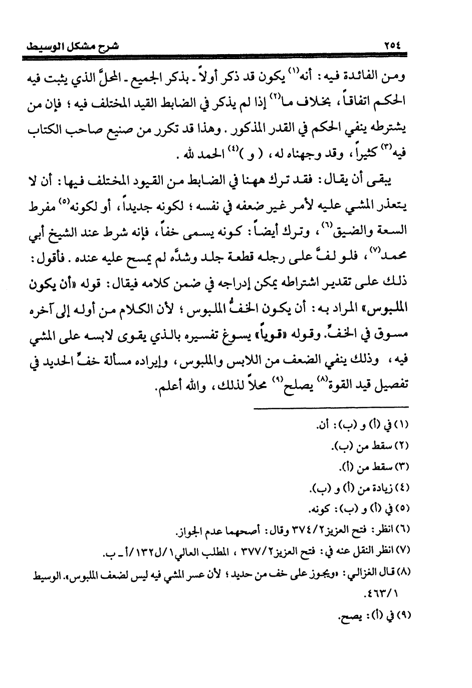 يبقى أن يقال: فقد ترك ههنا في الضابط من القيود المختلف فيها: أن لا يتعذر المشي عليه لأمر غير ضعفه في نفسه؛ لكونه جديداً، أو لكونه (¬5) مفرط السعة والضيق (¬6)، وترك أيضاً: كونه يسمى خفاً، فإنه شرط عند الشيخ أبي محمَّد (¬7)، فلو لفَّ على رجله قطعة جلد وشدَّه لم يمسح عليه عنده. فأقول: ذلك على تقدير اشتراطه يمكن إِدراجه في ضمن كلامه فيقال: قوله "أن يكون الملبوس" المراد به: أن يكون الخفُّ الملبوس؛ لأن الكلام من أوله إلى آخره مسوق في الخفِّ. وقوله "قوياً" يسوغ تفسيره بالذي يقوى لابسه على المشي فيه، وذلك ينفي الضعف من اللابس والملبوس، وإيراده مسألة خفِّ الحديد في تفصيل قيد القوة (¬8) يصلح (¬9) محلاً لذلك، والله أعلم.