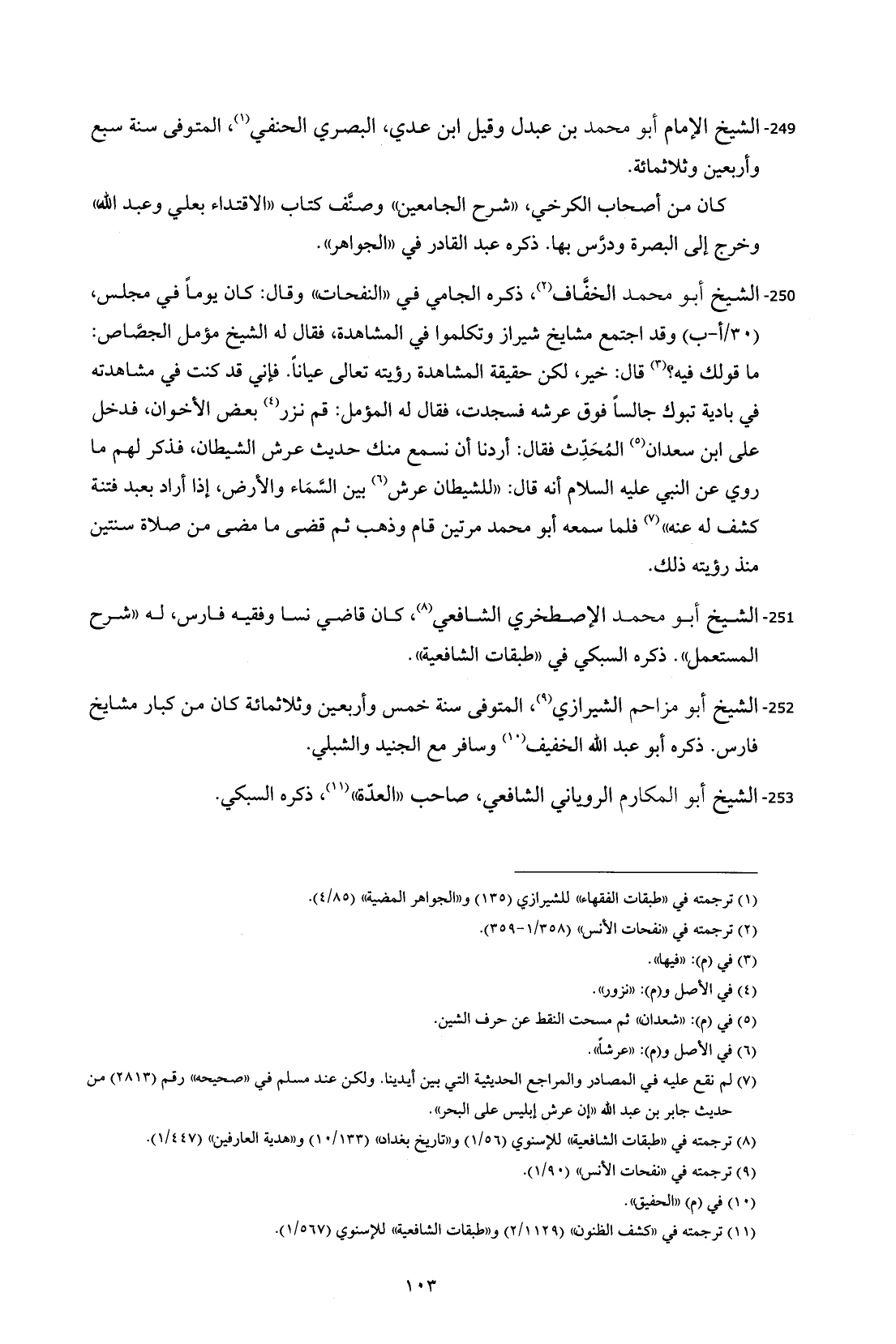 251 - الشيخ أبو محمد الإصطخري الشافعي (¬8)، كان قاضي نسا وفقيه فارس، له "شرح المستعمل". ذكره السبكي في "طبقات الشافعية".