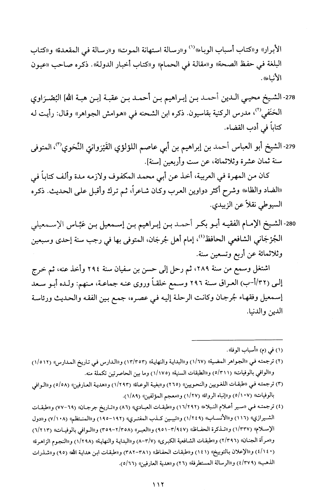 280 - الشيخ الإمام الفقيه أبو بكر أحمد بن إبراهيم بن إسمعيل بن عَبَّاس الإسمعيلي الجُرْجَاني الشافعي الحافظ (¬4)، إمام أهل جُرجَان، المتوفى بها في رجب سنة إحدى وسبعين وثلاثمائة عن أربع وتسعين سنة.