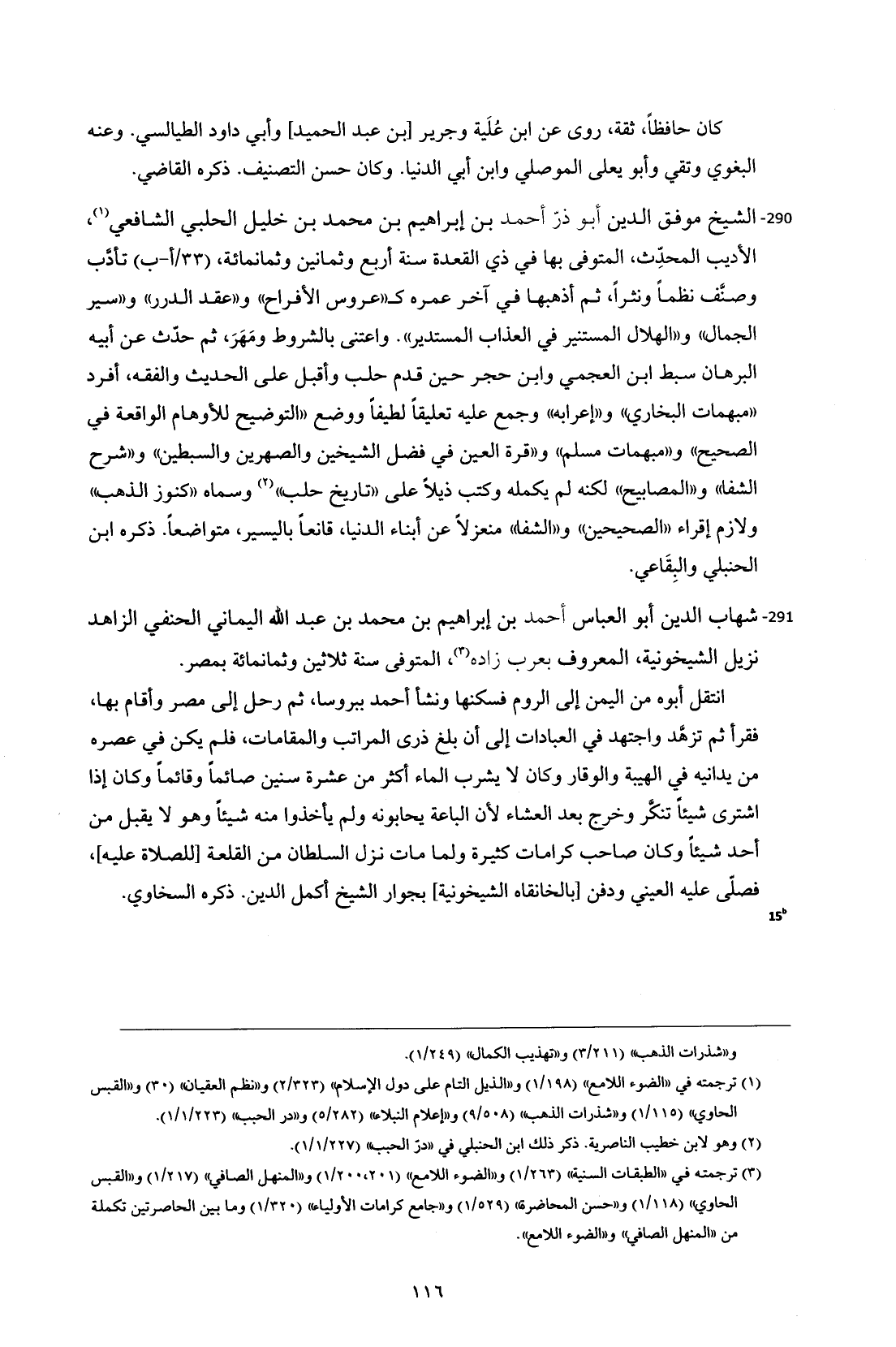 290 - الشيخ موفق الدين أبو ذرّ أحمد بن إبراهيم بن محمد بن خليل الحلبي الشافعي (¬1)، الأديب المحدِّث، المتوفى بها في ذي القعدة سنة أربع وثمانين وثمانمائة، (33/أ- ب) تأدَّب وصنَّف نظماً ونثراً، ثم أذهبها في آخر عمره كـ"عروس الأفراح" و"عقد الدرر" و"سير الجمال" و"الهلال المستنير في العذاب المستدير". واعتنى بالشروط ومَهَرَ، ثم حدّث عن أبيه البرهان سبط ابن العجمي وابن حجر حين قدم حلب وأقبل على الحديث والفقه، أفرد "مبهمات البخاري" و"إعرابه" وجمع عليه تعليقاً لطيفاً ووضع "التوضيح للاوهام الواقعة في الصحيح" و"مبهمات مسلم" و"قرة العين في فضل الشيخين والصهرين والسبطين" و"شرح الشفا" و"المصابيح" لكنه لم يكمله وكتب ذيلاً على "تاريخ حلب" (¬2) وسماه "كنوز الذهب" ولازم إقراء "الصحيحين" و"الشفا" منعزلاً عن أبناء الدنيا، قانعاً باليسير، متواضعاً. ذكره ابن الحنبلي والبِقَاعي.