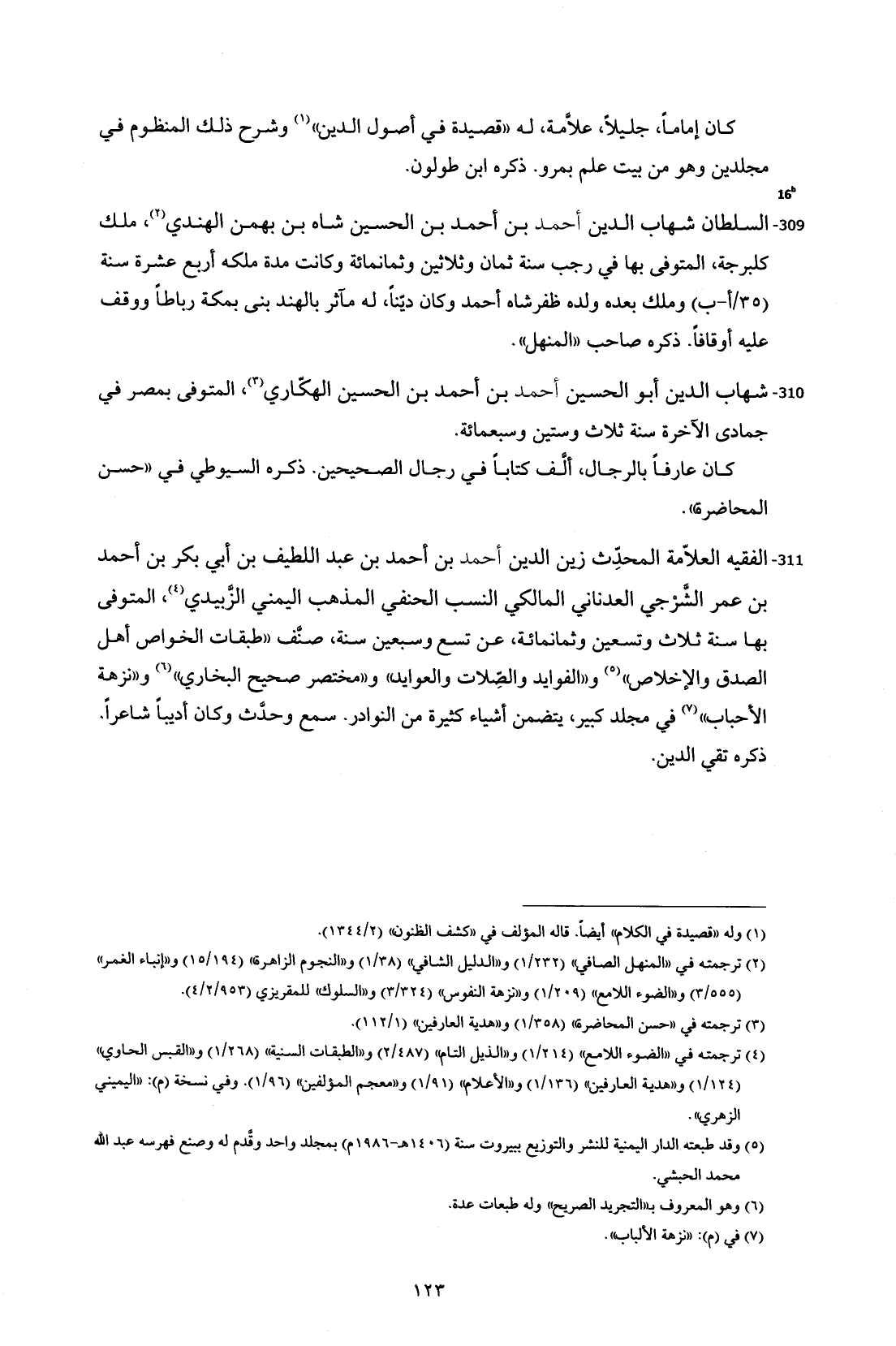 309 - السلطان شهاب الدين أحمد بن أحمد بن الحسين شاه بن بهمن الهندي (¬2)، ملك كلبرجة، المتوفى بها في رجب سنة ثمان وثلاثين وثمانمائة وكانت مدة ملكه أربع عشرة سنة (35 / أ- ب) وملك بعده ولده ظفرشاه أحمد وكان ديّنًا، له مآثر بالهند بنى بمكة رباطًا ووقف عليه أوقافًا. ذكره صاحب "المنهل".