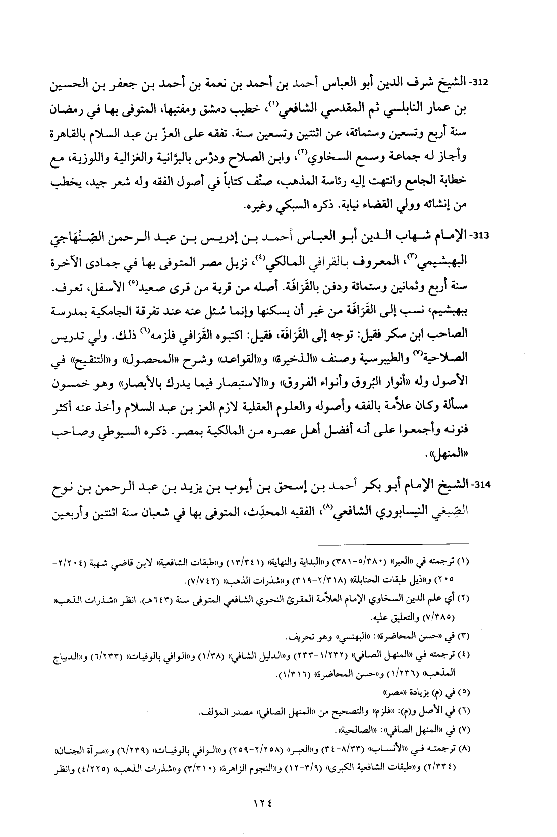313 - الإمام شهاب الدين أبو العباس أحمد بن إدريس بن عبد الرحمن الصِّنْهَاجيّ البهبشيمي (¬3)، المعروف بالقرافي المالكي (¬4)، نزيل مصر المتوفى بها في جمادى الآخرة سنة أربع وثمانين وستمائة ودفن بالقَرَافَة. أصله من قرية من قرى صعيد (¬5) الأسفل، تعرف. ببهبشيم، نسب إِلى القَرَافَة من غير أن يسكنها وإنما سُئل عنه عند تفرقة الجامكية بمدرسة الصاحب ابن سكر فقيل: توجه إلى القَرَافَة، فقيل: اكتبوه القَرَافي فلزمه (¬6) ذلك. ولي تدريس الصلاحية (¬7) والطيبرسية وصنَّف "الذخيرة" و"القواعد" وشرح "المحصول" و"التنقيح" في الأصول وله "أنوار البُروق وأنواء الفروق" و"الاستبصار فيما يدرك بالأبصار" وهو خمسون مسألة وكان علَّامة بالفقه وأصوله والعلوم العقلية لازم العز بن عبد السلام وأخذ عنه أكثر فنونه وأجمعوا على أنه أفضل أهل عصره من المالكية بمصر. ذكره السيوطي وصاحب "المنهل".