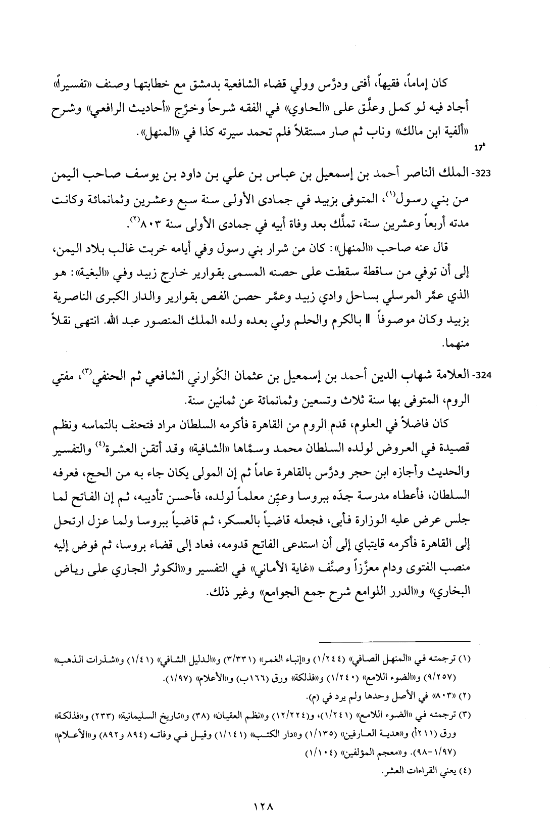 324 - العلامة شهاب الدين أحمد بن إسمعيل بن عثمان الكُوارني الشافعي ثم الحنفي (¬3)، مفتي الروم، المتوفى بها سنة ثلاث وتسعين وثمانمائة عن ثمانين سنة.