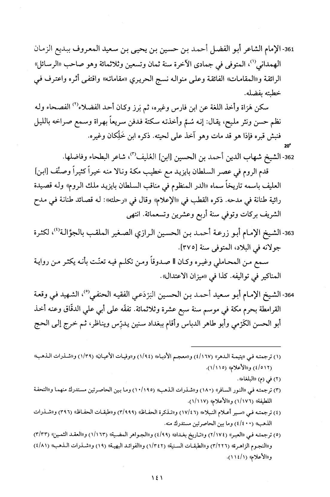 361 - الإمام الشاعر أبو الفضل أحمد بن حسين بن يحيى بن سعيد المعروف ببديع الزمان الهمداني (¬1)، المتوفى في جمادى الآخرة سنة ثمان وتسعين وثلاثمائة وهو صاحب "الرسائل" الرائقة و"المقامات" الفائقة وعلى منواله نسج الحريري "مقاماته" واقتفى أثره واعترف في خطبته بفضله.
