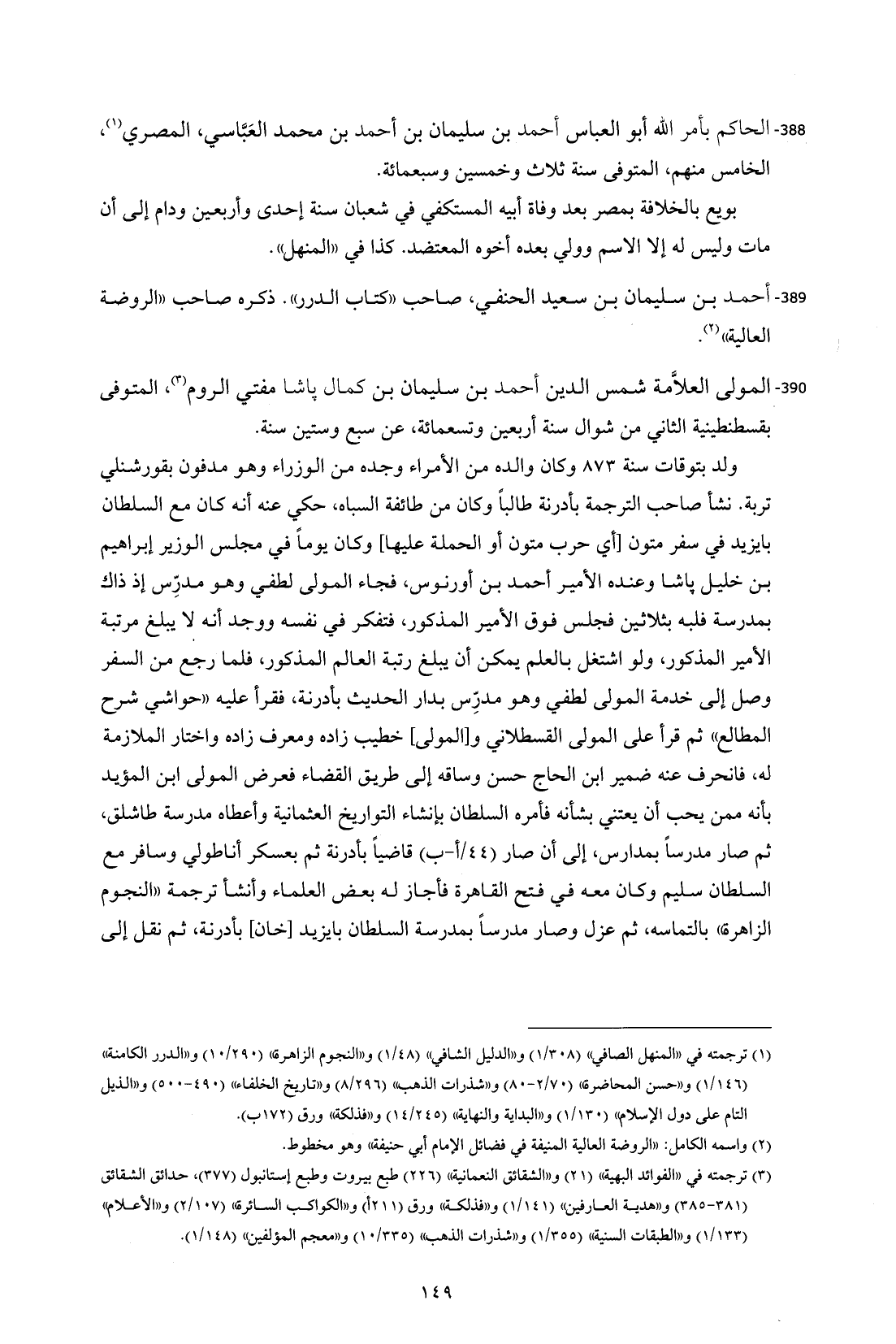 390 - المولى العلَّامة شمس الدين أحمد بن سليمان بن كمال ياشا مفتي الروم (¬3)، المتوفى بقسطنطينية الثاني من شوال سنة أربعين وتسعمائة، عن سبع وستين سنة.