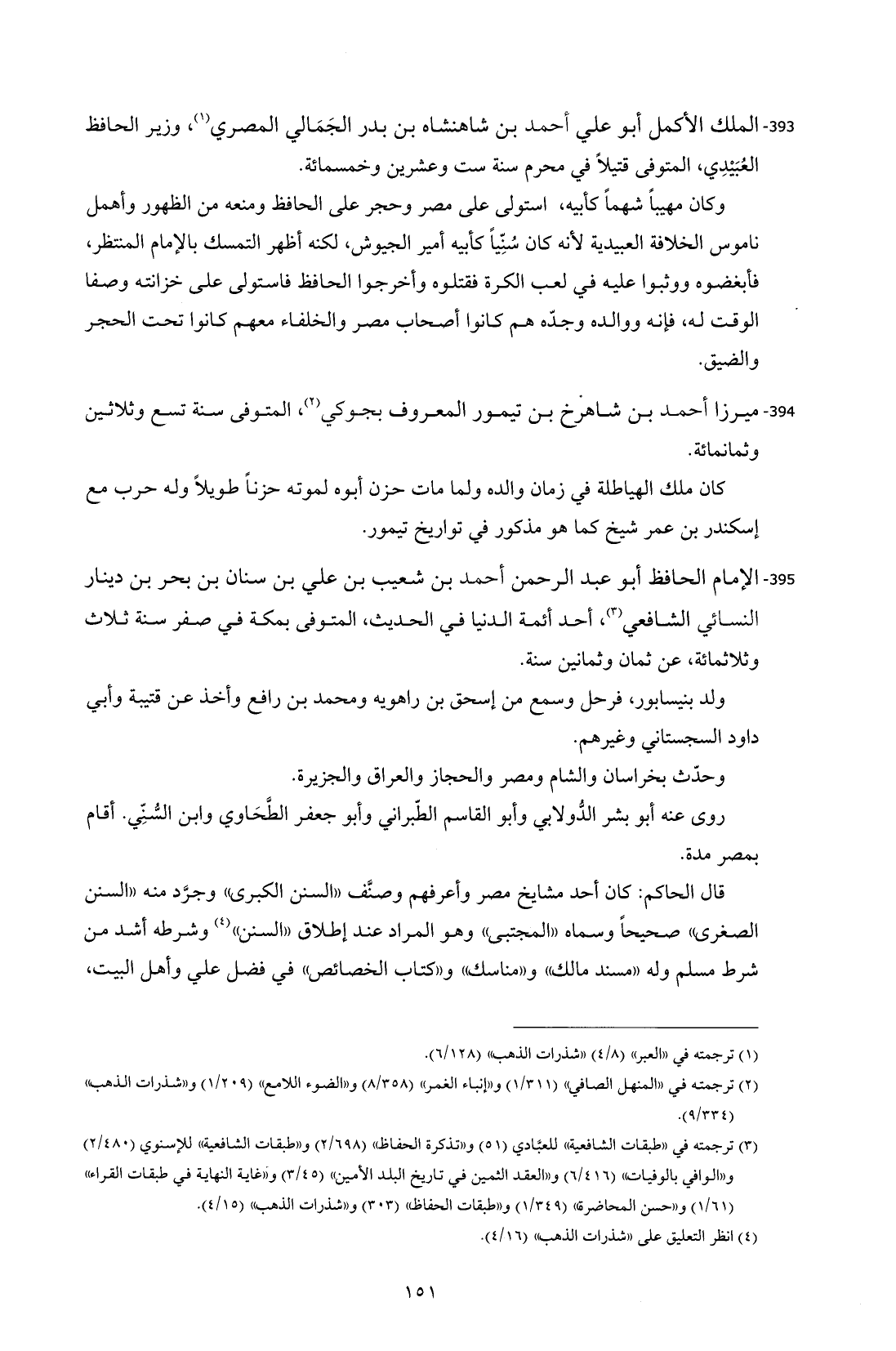 395 - الإمام الحافظ أبو عبد الرحمن أحمد بن شعيب بن علي بن سنان بن بحر بن دينار النسائي الشافعي (¬3)، أحد أئمة الدنيا في الحديث، المتوفى بمكة في صفر سنة ثلاث وثلاثمائة، عن ثمان وثمانين سنة.