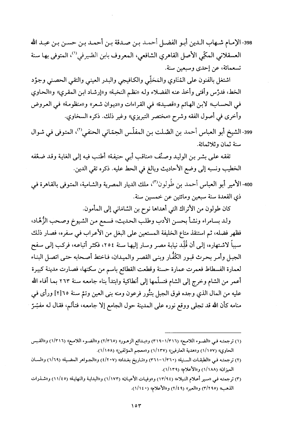 400 - الأمير أبو العباس أحمد بن طُولون (¬3)، ملك الديار المصرية والشامية، المتوفى بالقاهرة في ذي القعدة سنة سبعين ومائتين عن خمسين سنة.