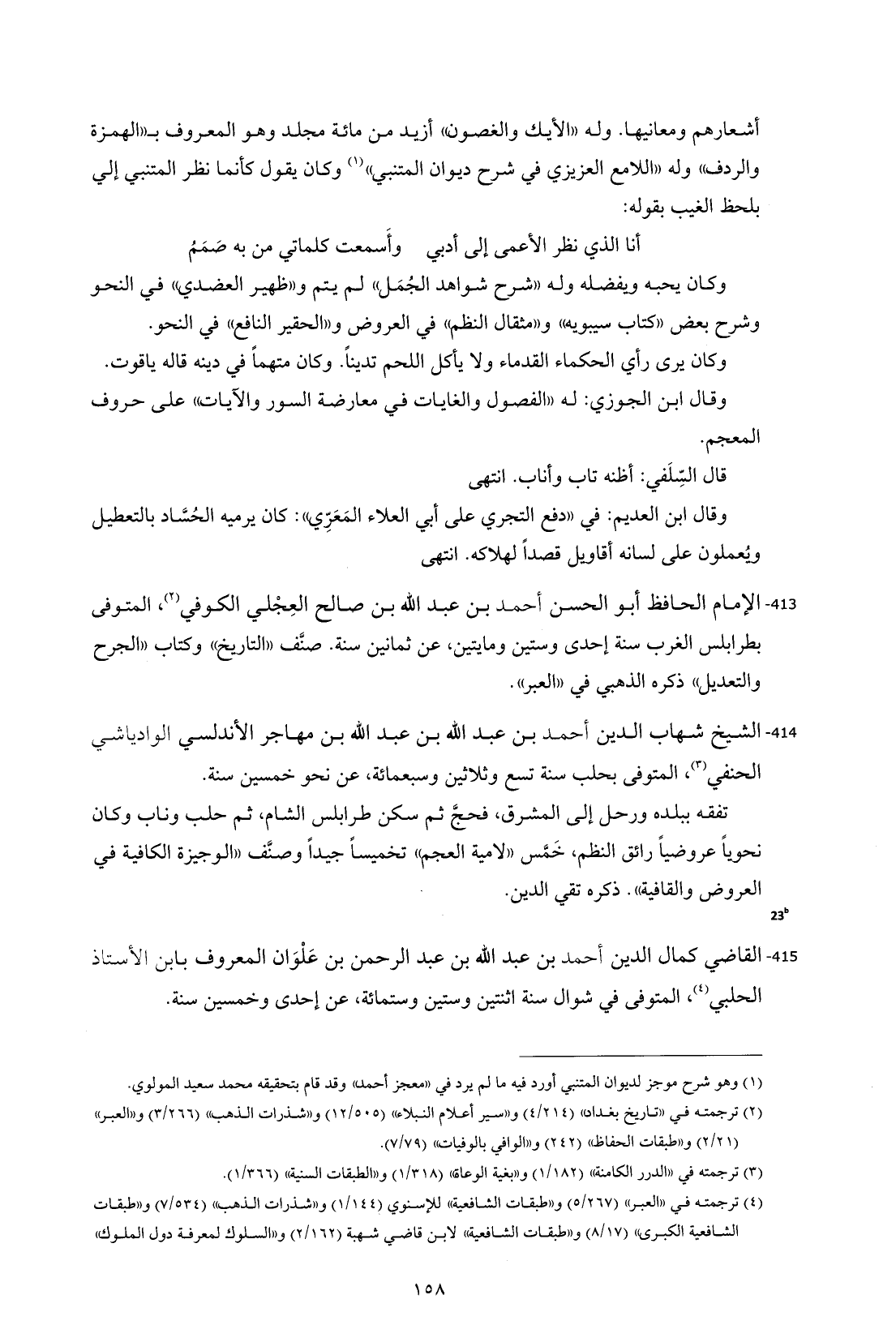 415 - القاضي كمال الدين أحمد بن عبد الله بن عبد الرحمن بن عَلْوَان المعروف بابن الأستاذ الحلبي (¬4)، المتوفى في شوال سنة اثنتين وستين وستمائة، عن إحدى وخمسين سنة.