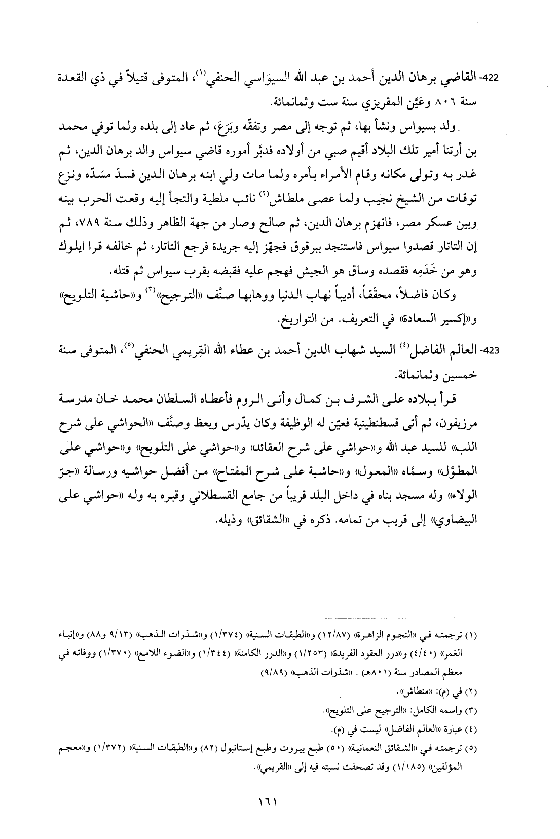 422 - القاضي برهان الدين أحمد بن عبد الله السيوَاسي الحنفي (¬1)، المتوفى قتيلًا في ذي القعدة سنة 806 وعَيَّن المقريزي سنة ست وثمانمائة.