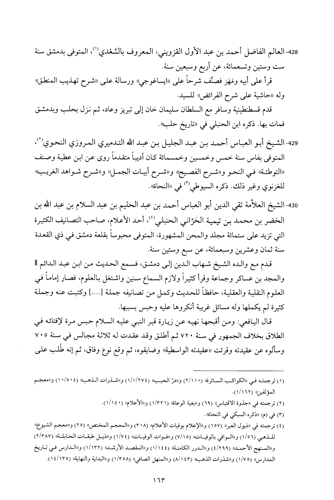 430 - الشيخ العلَّامة تقي الدين أبو العباس أحمد بن عبد الحليم بن عبد السلام بن عبد الله بن الخضر بن محمد بن تيمية الحَرَّاني الحنبلي (¬4)، أحد الأعلام، صاحب التصانيف الكثيرة التي تزيد على ستمائة مجلد والمحن المشهورة، المتوفى محبوسًا بقلعة دمشق في ذي القعدة سنة ثمان وعشرين وسبعمائة، عن سبع وستين سنة.