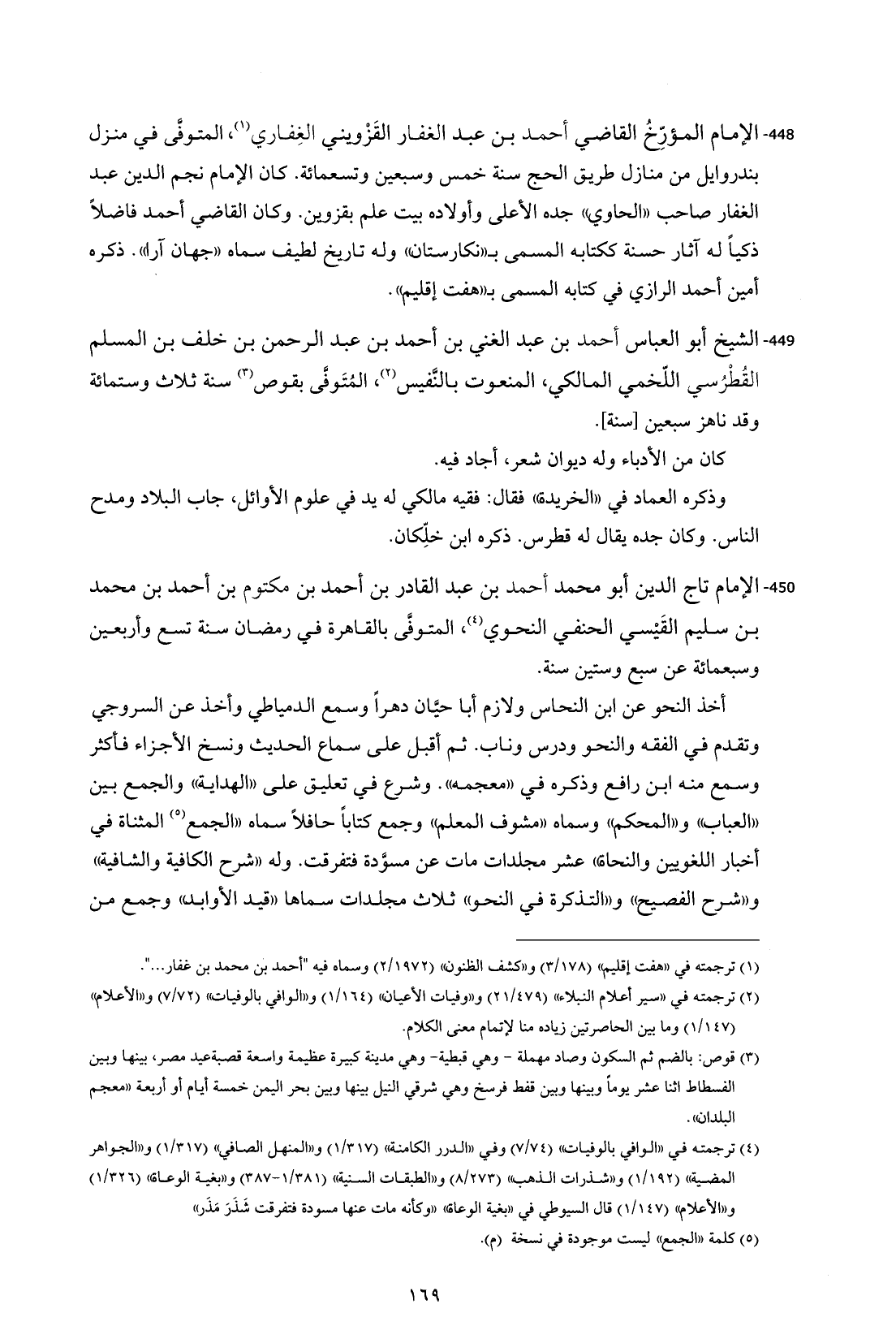 448 - الإمام المؤرِّخُ القاضي أحمد بن عبد الغفار القَزْويني الغِفاري (¬1)، المتوفى في منزل بندروايل من منازل طريق الحج سنة خمس وسبعين وتسعمائة. كان الإمام نجم الدين عبد الغفار صاحب "الحاوي" جده الأعلى وأولاده بيت علم بقزوين. وكان القاضي أحمد فاضلًا ذكيًا له آثار حسنة ككتابه المسمى بـ "نكارستان" وله تاريخ لطيف سماه "جهان آرا". ذكره أمين أحمد الرازي في كتابه المسمى بـ "هفت إقليم".