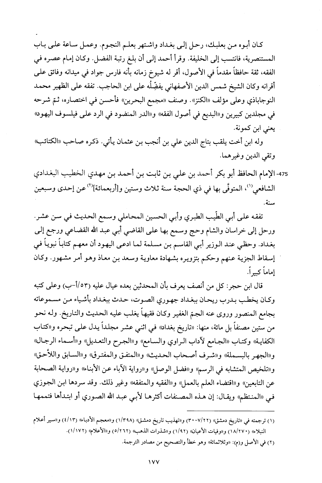 475 - الإمام الحافظ أبو بكر أحمد بن علي بن ثابت بن أحمد بن مهدي الخطيب البغدادي الشافعي (¬1)، المتوفَّى بها في ذي الحجة سنة ثلاث وستين و [أربعمائة] (¬2) عن إحدى وسبعين سنة.