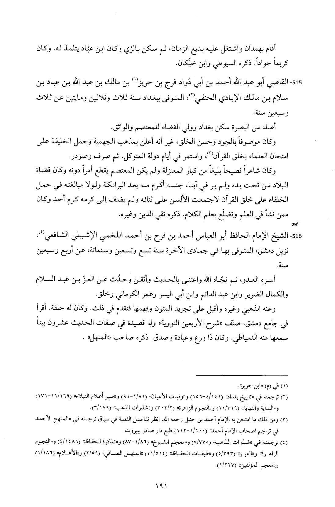 515 - القاضي أبو عبد الله أحمد بن أبي دُواد فرج بن حريز (¬1) بن مالك بن عبد الله بن عباد بن سلام بن مالك الإيادي الحنفي (¬2)، المتوفى ببغداد سنة ثلاث وثلاثين ومائتين عن ثلاث وسبعين سنة.
