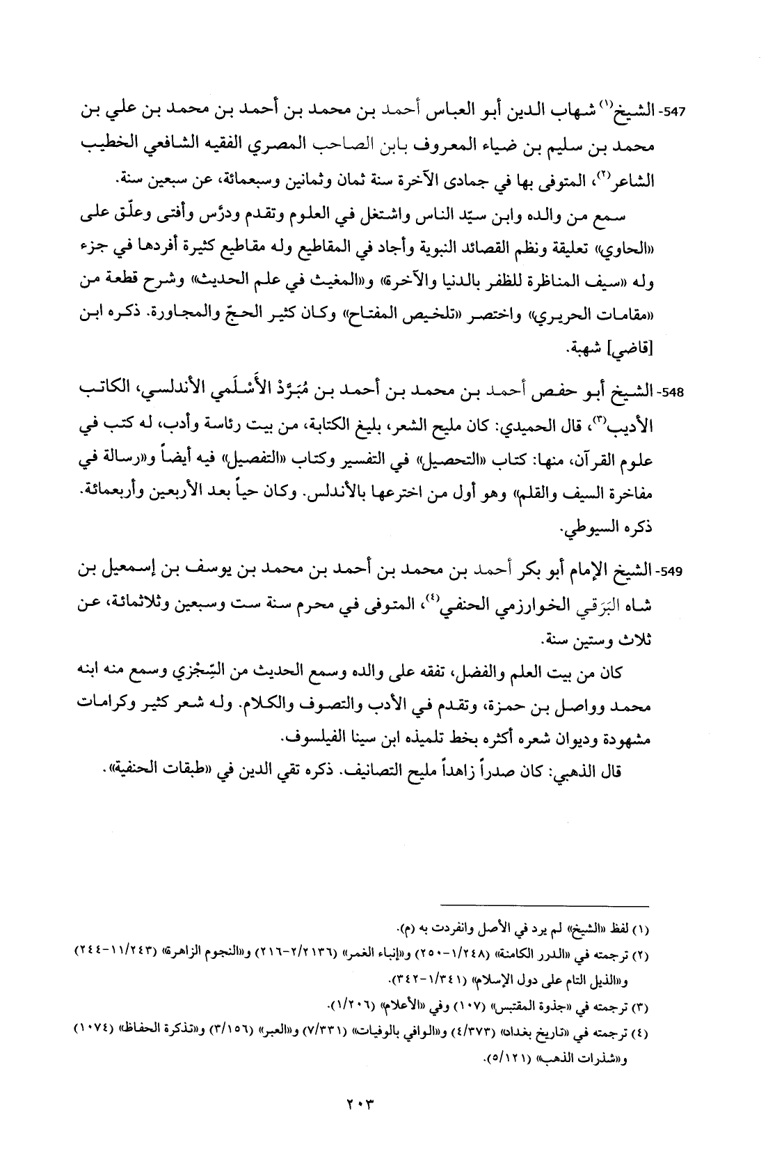 547 - الشيخ (¬1) شهاب الدين أبو العباس أحمد بن محمد بن أحمد بن محمد بن علي بن محمد بن سليم بن ضياء المعروف بابن الصاحب المصري الفقيه الشافعي الخطيب الشاعر (¬2)، المتوفى بها في جمادى الآخرة سنة ثمان وثمانين وسبعمائة، عن سبعين سنة.