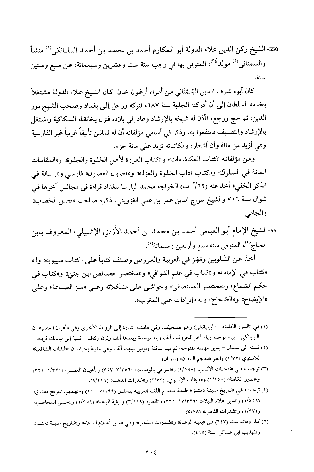 550 - الشيخ ركن الدين علاء الدولة أبو المكارم أحمد بن محمد بن أحمد البيابانكي (¬1) منشأ والسمناني (¬2) مولداً (¬3)، المتوفى بها في رجب سنة ست وعشرين وسبعمائة، عن سبع وستين سنة.