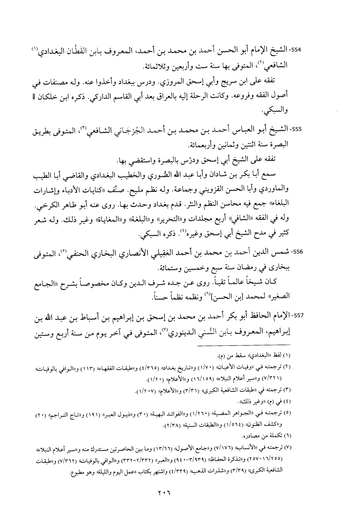 557 - الإمام الحافظ أبو بكر أحمد بن محمد بن إسحق بن إبراهيم بن أسباط بن عبد الله بن إبراهيم، المعروف بابن السُّني الدينوري (¬7)، المتوفى في آخر يوم من سنة أربع وستين