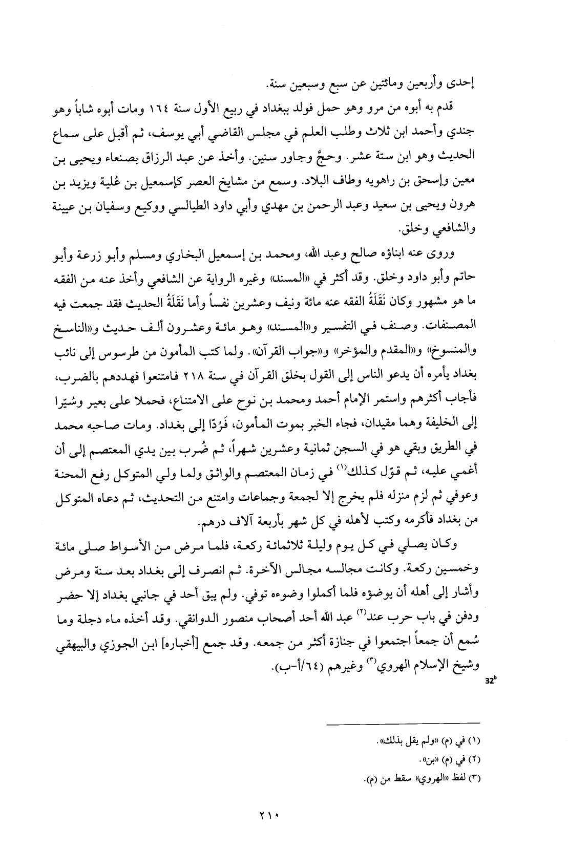 وروى عنه أبناؤه صالح وعبد الله، ومحمد بن إسمعيل البخاري ومسلم وأبو زرعة وأبو حاتم وأبو داود وخلق. وقد أكثر في "المسند" وغيره الرواية عن الشافعي وأخذ عنه من الفقه ما هو مشهور وكان نَقَلَةُ الفقه عنه مائة ونيف وعشرين نفساً وأما نَقَلَةُ الحديث فقد جمعت فيه المصنفات. وصنَّف في التفسير و"المسند" وهو مائة وعشرون ألف حديث و"الناسخ والمنسوخ" و"المقدم والمؤخر" و"جواب القرآن". ولما كتب المأمون من طرسوس إلى نائب بغداد يأمره أن يدعو الناس إلى القول بخلق القرآن في سنة 218 فامتنعوا فهددهم بالضرب، فأجاب أكثرهم واستمر الإمام أحمد ومحمد بن نوح على الامتناع، فحملا على بعير وسُيّرا إلى الخليفة وهما مقيدان، فجاء الخبر بموت المأمون، فَرُدّا إلى بغداد. ومات صاحبه محمد في الطريق وبقي هو في السجن ثمانية وعشرين شهراً، ثم ضُرب بين يدي المعتصم إلى أن أغمي عليه، ثم قوّل كذلك (¬1) في زمان المعتصم والواثق ولما ولي المتوكل رفع المحنة وعوفي ثم لزم منزله فلم يخرج إلا لجمعة وجماعات وامتنع من التحديث، ثم دعاه المتوكل من بغداد فأكرمه وكتب لأهله في كل شهر بأربعة آلاف درهم.