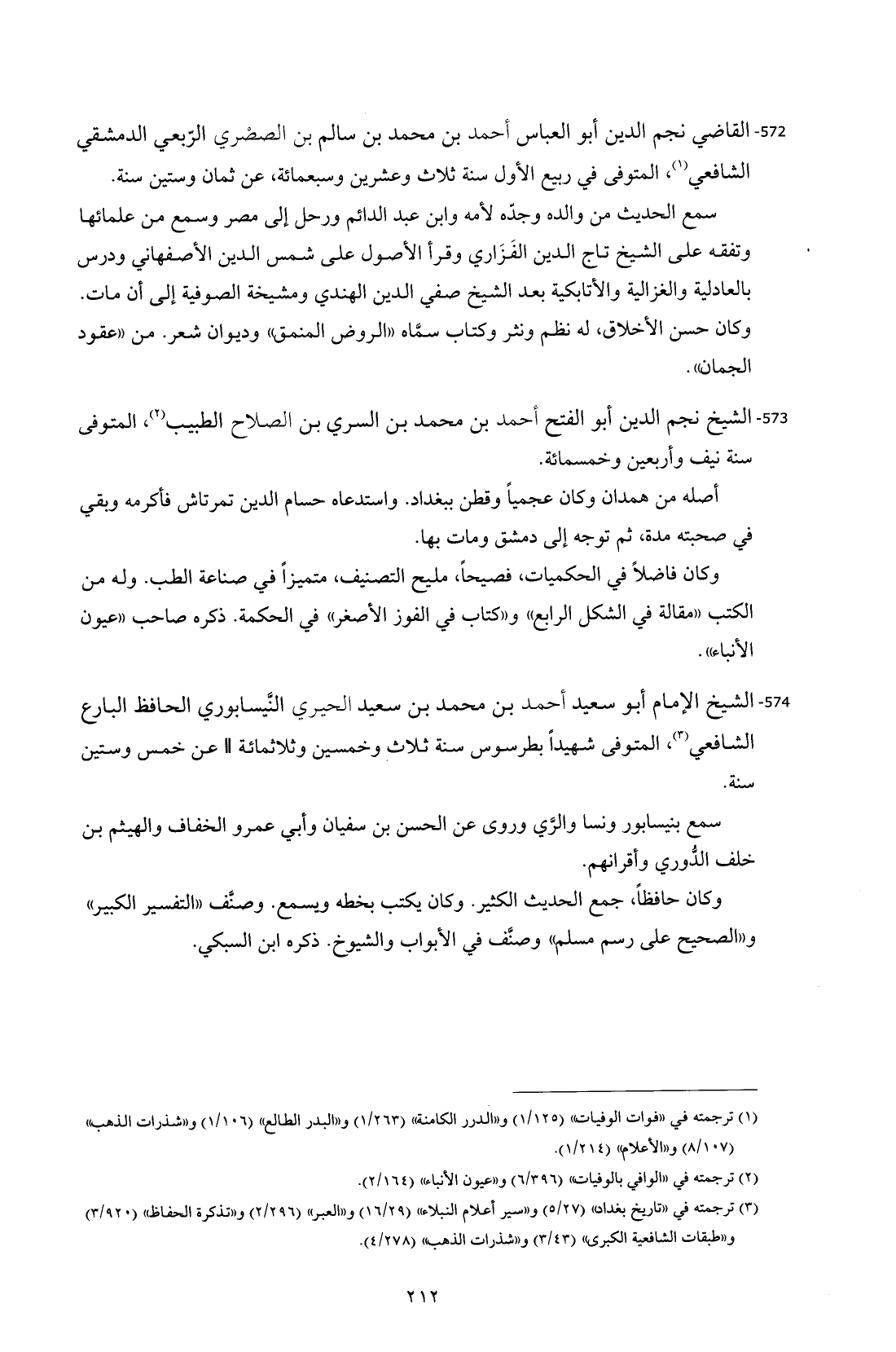 573 - الشيخ نجم الدين أبو الفتح أحمد بن محمد بن السري بن الصلاح الطبيب (¬2)، المتوفى سنة نيف وأربعين وخمسمائة.