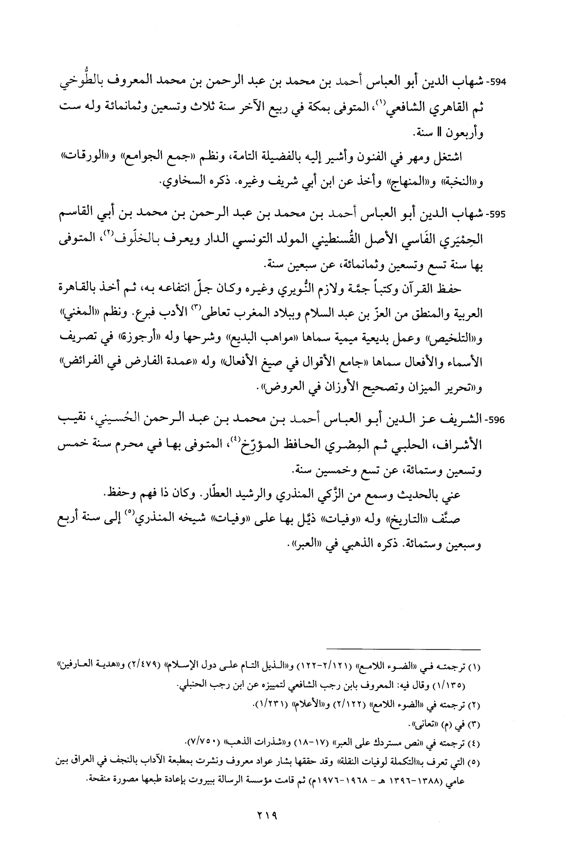594 - شهاب الدين أبو العباس أحمد بن محمد بن عبد الرحمن بن محمد المعروف بالطُّوخي ثم القاهري الشافعي (¬1)، المتوفى بمكة في ربيع الآخر سنة ثلاث وتسعين وثمانمائة وله ست وأربعون سنة.