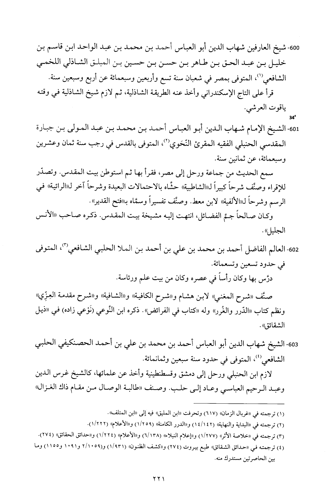 603 - الشيخ شهاب الدين أبو العباس أحمد بن محمد بن علي بن أحمد الحصنكيفي الحلبي الشافعي (¬4)، المتوفى في حدود سنة سبعين وثمانمائة.