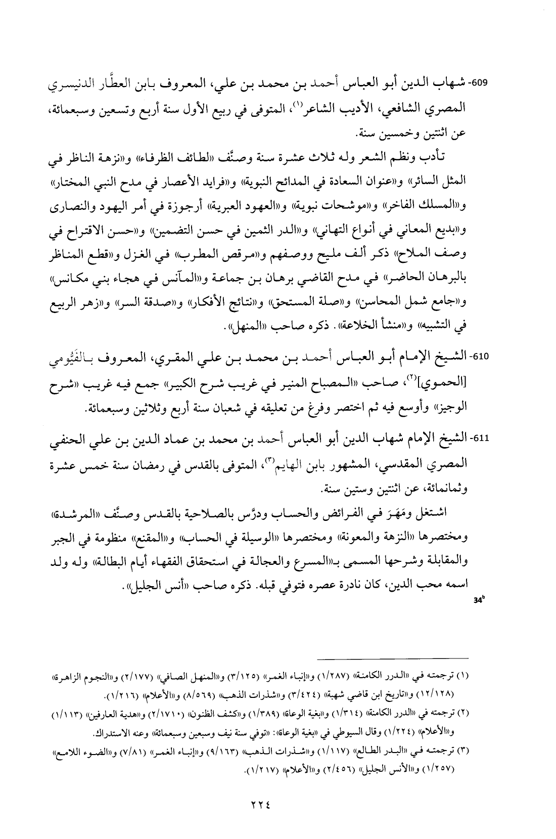 610 - الشيخ الإِمام أبو العباس أحمد بن محمد بن علي المقري، المعروف بالفَيُّومي [الحموي] (¬2)، صاحب "المصباح المنير في غريب شرح الكبير" جمع فيه غريب "شرح الوجيز" وأوسع فيه ثم اختصر وفرغ من تعليقه في شعبان سنة أربع وثلاثين وسبعمائة.