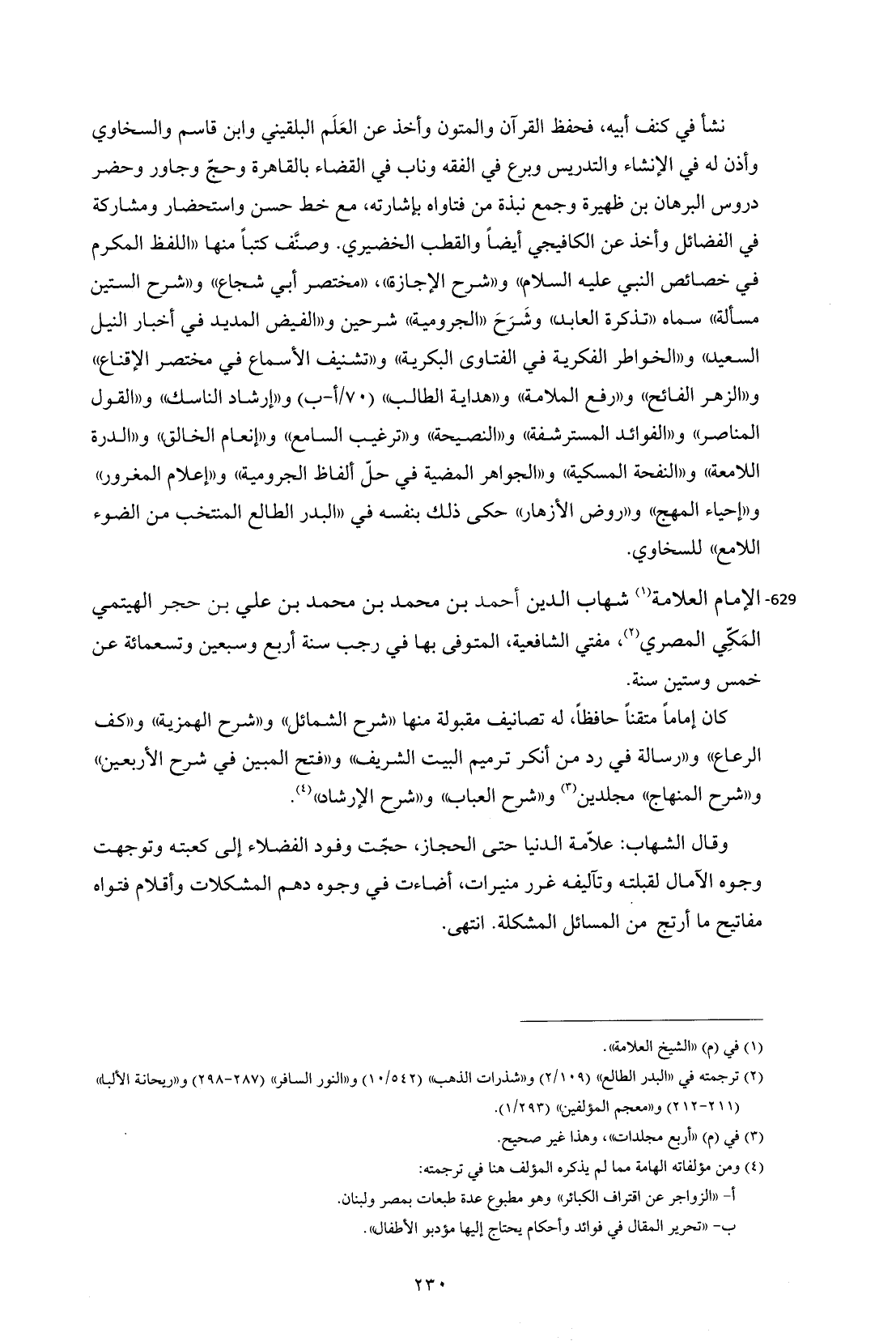 629 - الإمام العلامة (¬1) شهاب الدين أحمد بن محمد بن محمد بن علي بن حجر الهيتمي المَكِّي المصري (¬2)، مفتي الشافعية، المتوفى بها في رجب سنة أربع وسبعين وتسعمائة عن خمس وستين سنة.