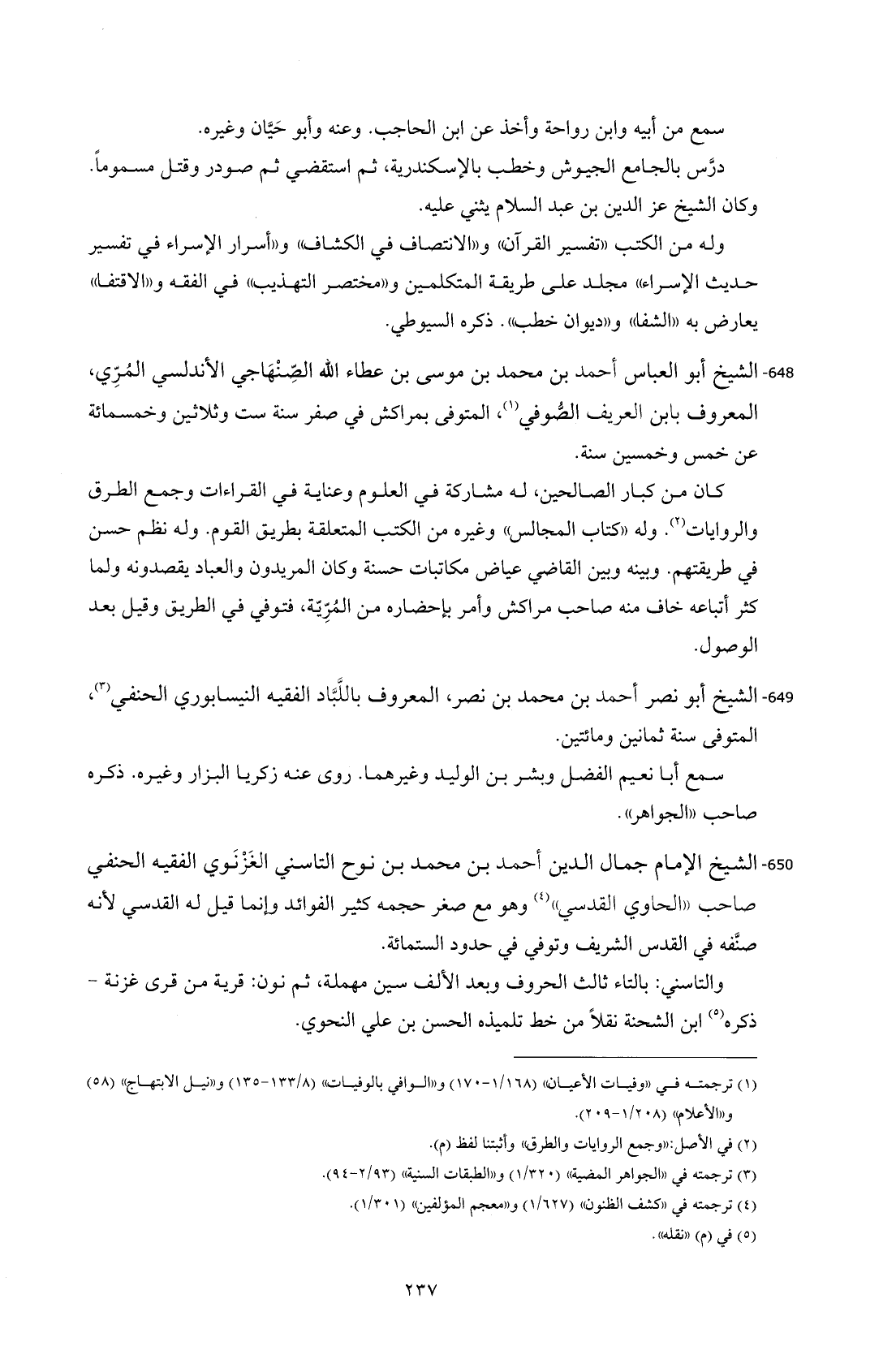 650 - الشيخ الإمام جمال الدين أحمد بن محمد بن نوح التاسني الغَزْنَوي الفقيه الحنفي صاحب "الحاوي القدسي" (¬4) وهو مع صغر حجمه كثير الفوائد وإنما قيل له القدسي لأنه صنَّفه في القدس الشريف وتوفي في حدود الستمائة.