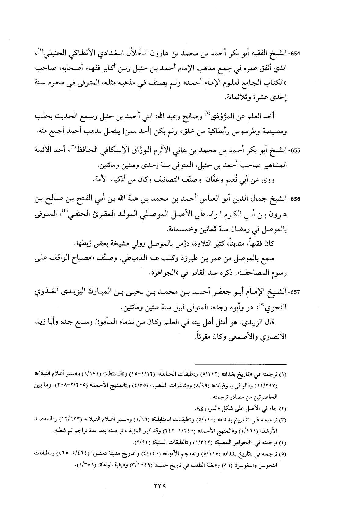 654 - الشيخ الفقيه أبو بكر أحمد بن محمد بن هارون الخَلاَّل البغدادي الأنطاكي الحنبلي (¬1)، الذي أنفق عمره في جمع مذهب الإمام أحمد بن حنبل ومن أكابر فقهاء أصحابه، صاحب "الكتاب الجامع لعلوم الإمام أحمد" ولم يصنف في مذهبه مثله، المتوفى في محرم سنة إحدى عشرة وثلاثمائة.