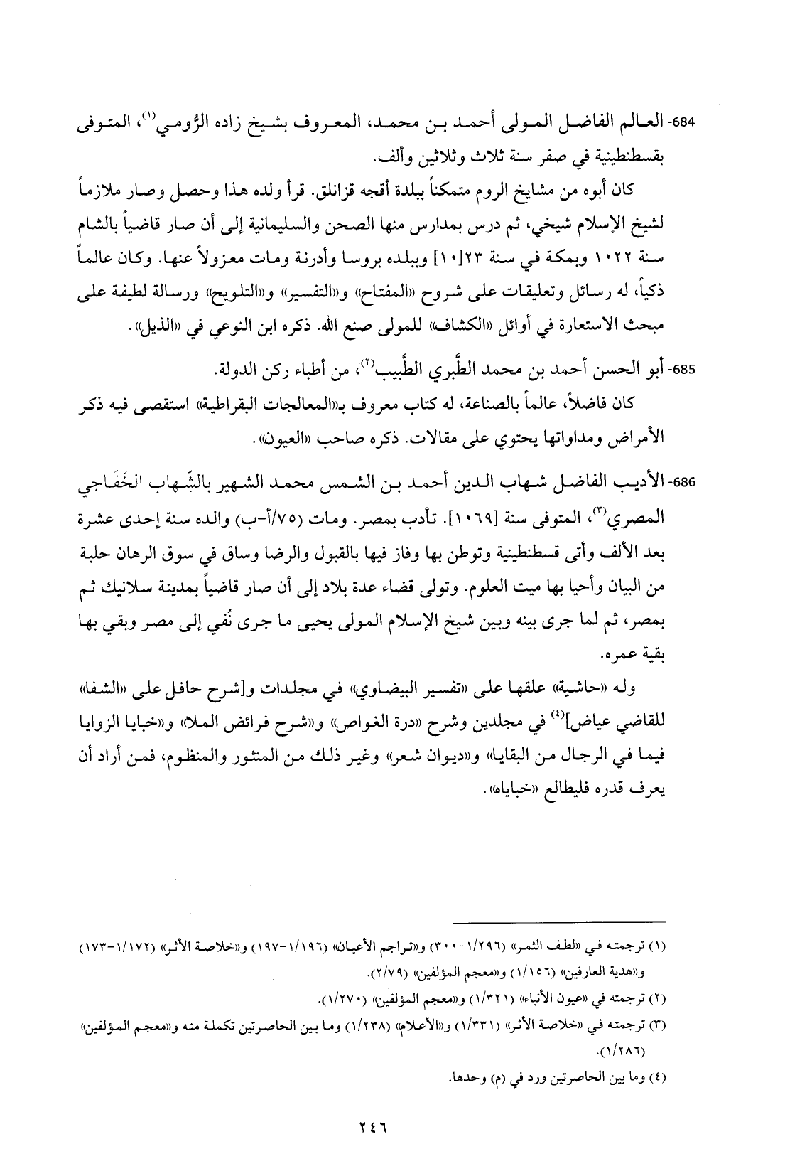 684 - العالم الفاضل المولى أحمد بن محمد، المعروف بشيخ زاده الرُّومي (¬1)، المتوفى بقسطنطينية في صفر سنة ثلاث وثلاثين وألف.