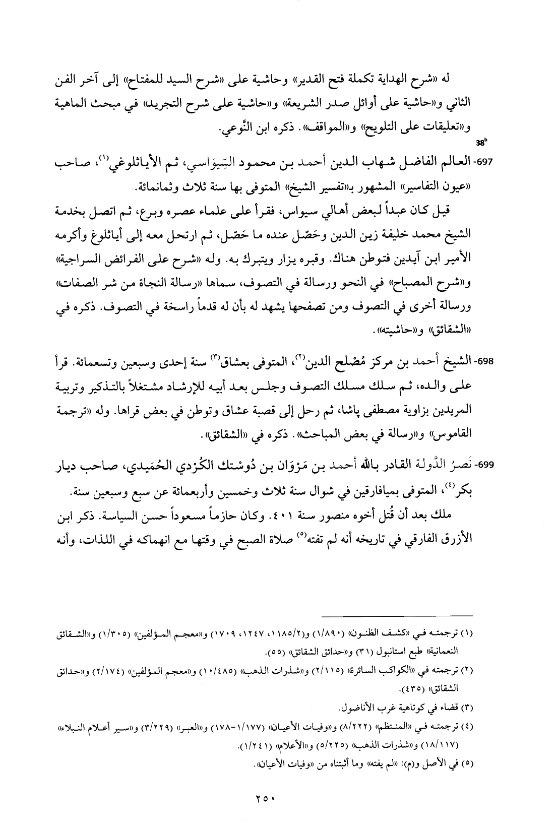 697 - العالم الفاضل شهاب الدين أحمد بن محمود السِّيوَاسي، ثم الأياثلوغي (¬1)، صاحب "عيون التفاسير" المشهور بـ"تفسير الشيخ" المتوفى بها سنة ثلاث وثمانمائة.