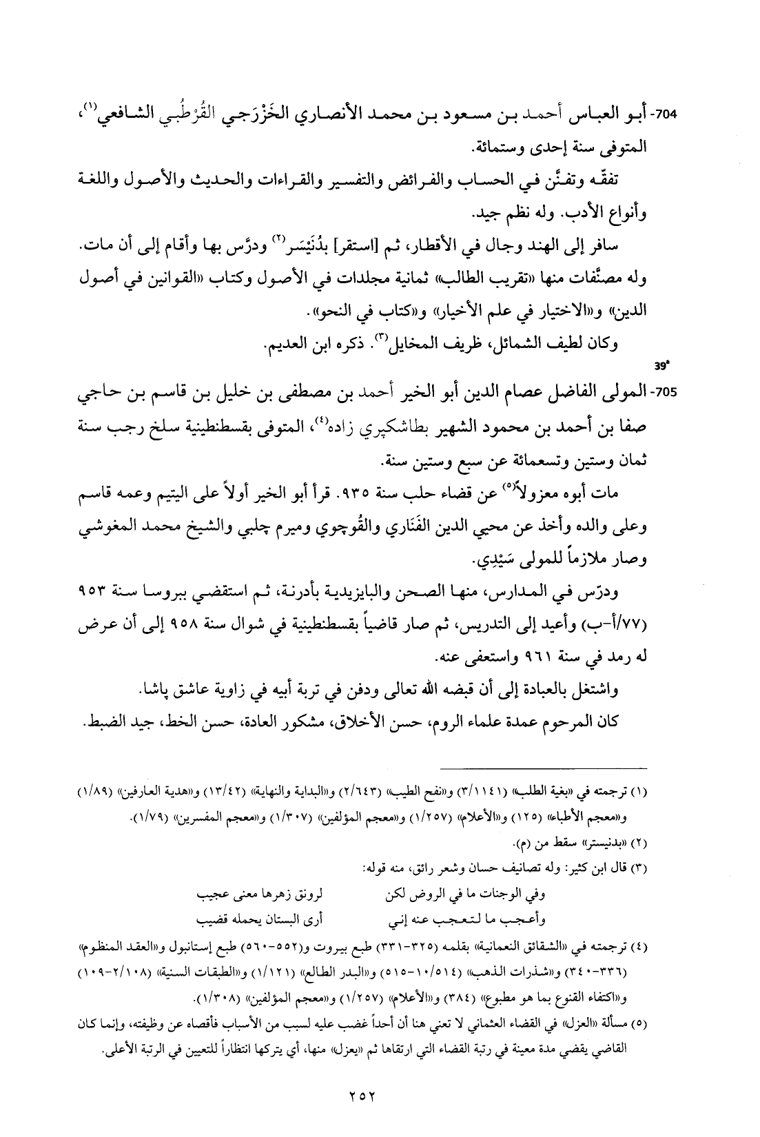705 - المولى الفاضل عصام الدين أبو الخير أحمد بن مصطفى بن خليل بن قاسم بن حاجي صفا بن أحمد بن محمود الشهير بطاشكيري زاده (¬4)، المتوفى بقسطنطينية سلخ رجب سنة ثمان وستين وتسعمائة عن سبع وستين سنة.