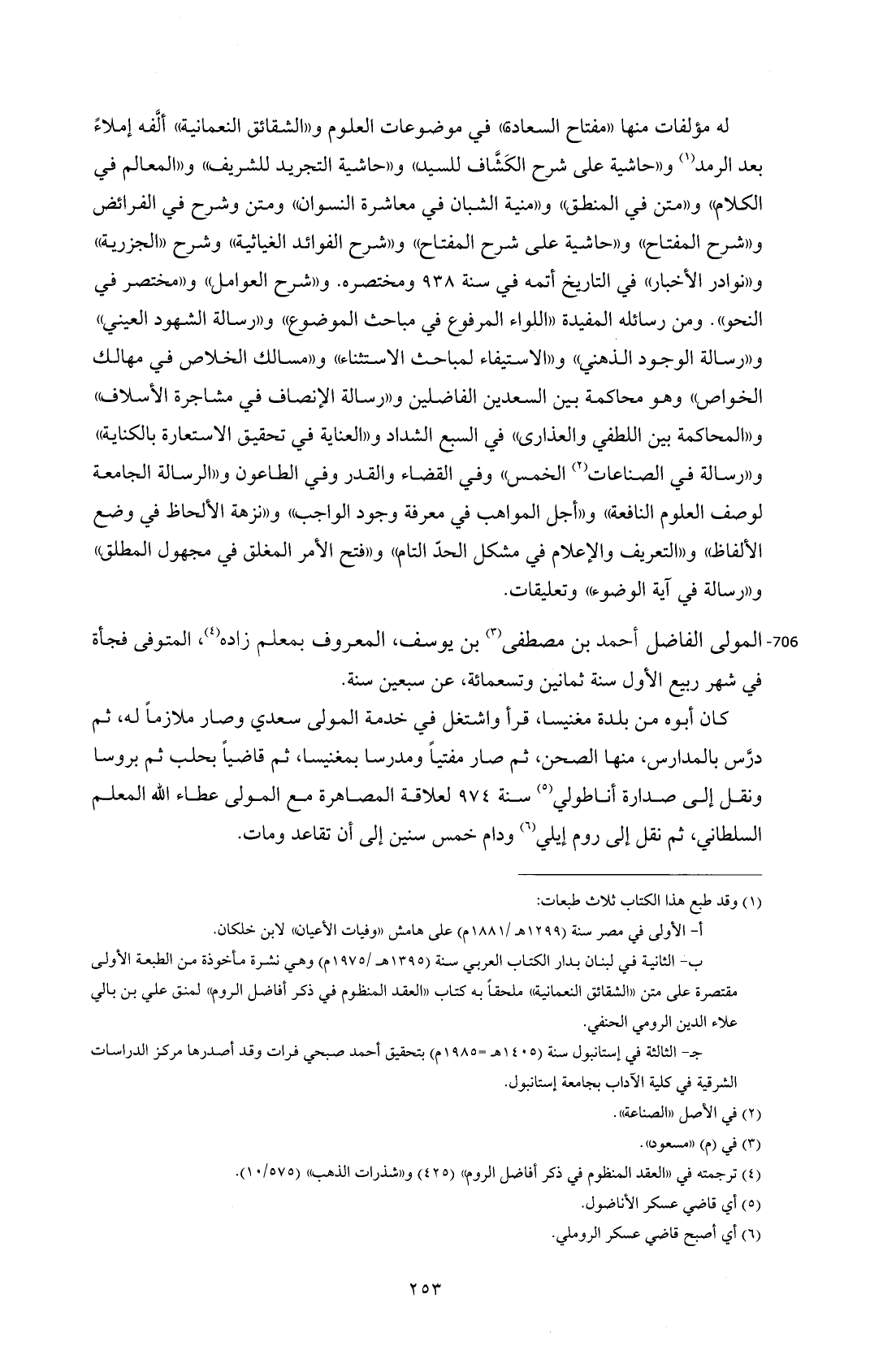 706 - المولى الفاضل أحمد بن مصطفى (¬3) بن يوسف، المعروف بمعلم زاده (¬4)، المتوفى فجأة في شهر ربيع الأول سنة ثمانين وتسعمائة، عن سبعين سنة.