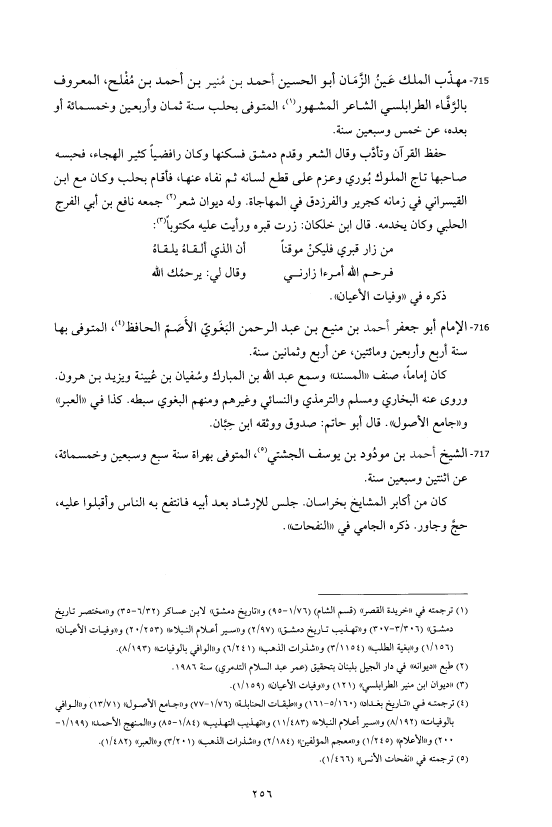 715 - مهذّب الملك عَينُ الزَّمَان أبو الحسين أحمد بن مُنير بن أحمد بن مُفْلح، المعروف بالرَّفَّاء الطرابلسي الشاعر المشهور (¬1)، المتوفى بحلب سنة ثمان وأربعين وخمسمائة أو بعده، عن خمس وسبعين سنة.