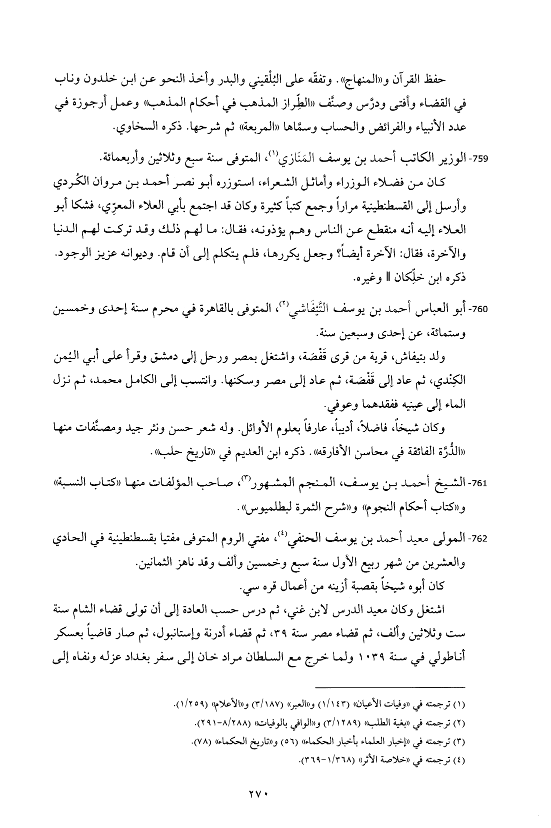 759 - الوزير الكاتب أحمد بن يوسف المَنَازي (¬1)، المتوفى سنة سبع وثلاثين وأربعمائة.
