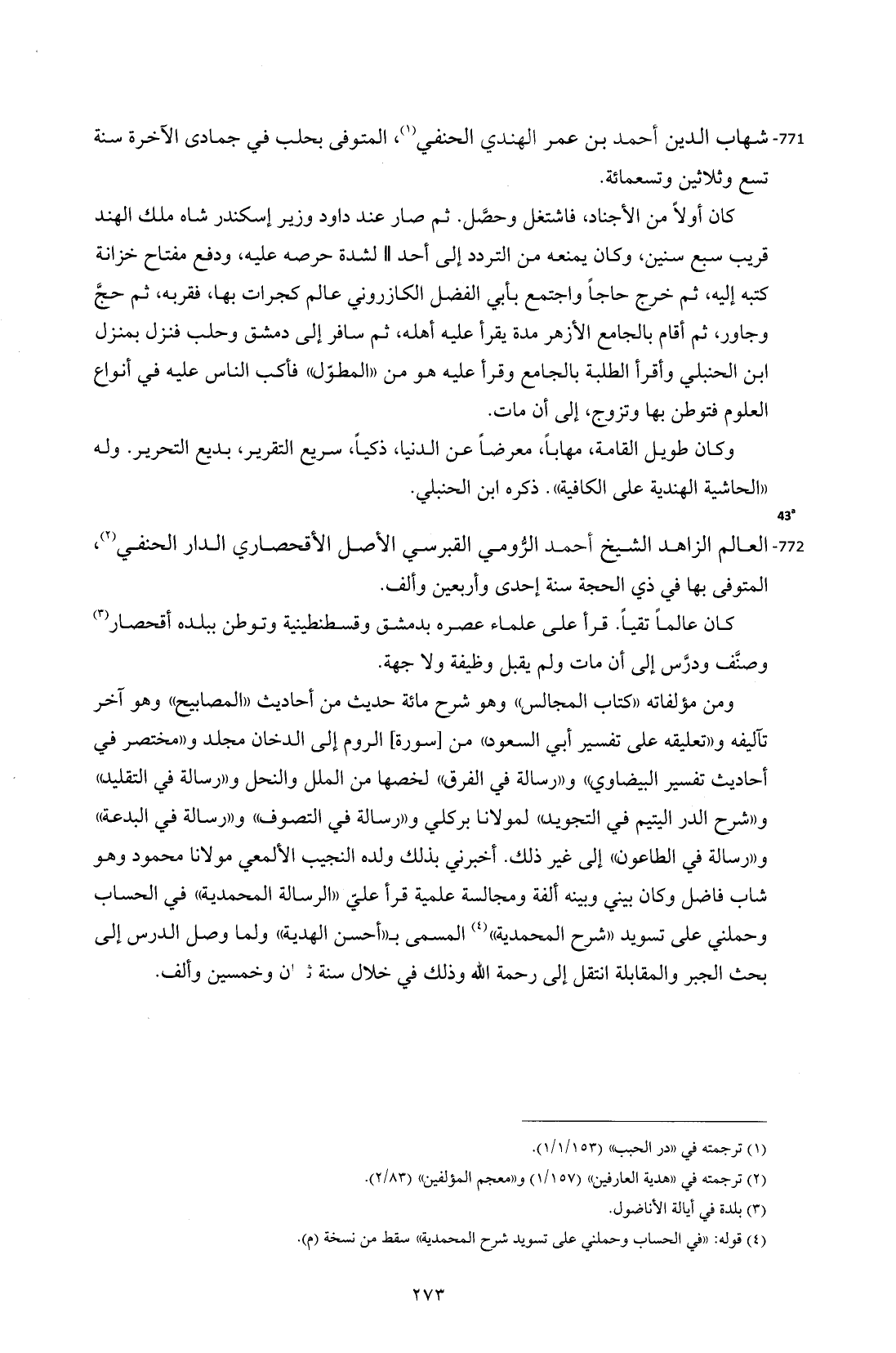 771 - شهاب الدين أحمد بن عمر الهندي الحنفي (¬1)، المتوفى بحلب في جمادى الآخرة سنة تسع وثلاثين وتسعمائة.