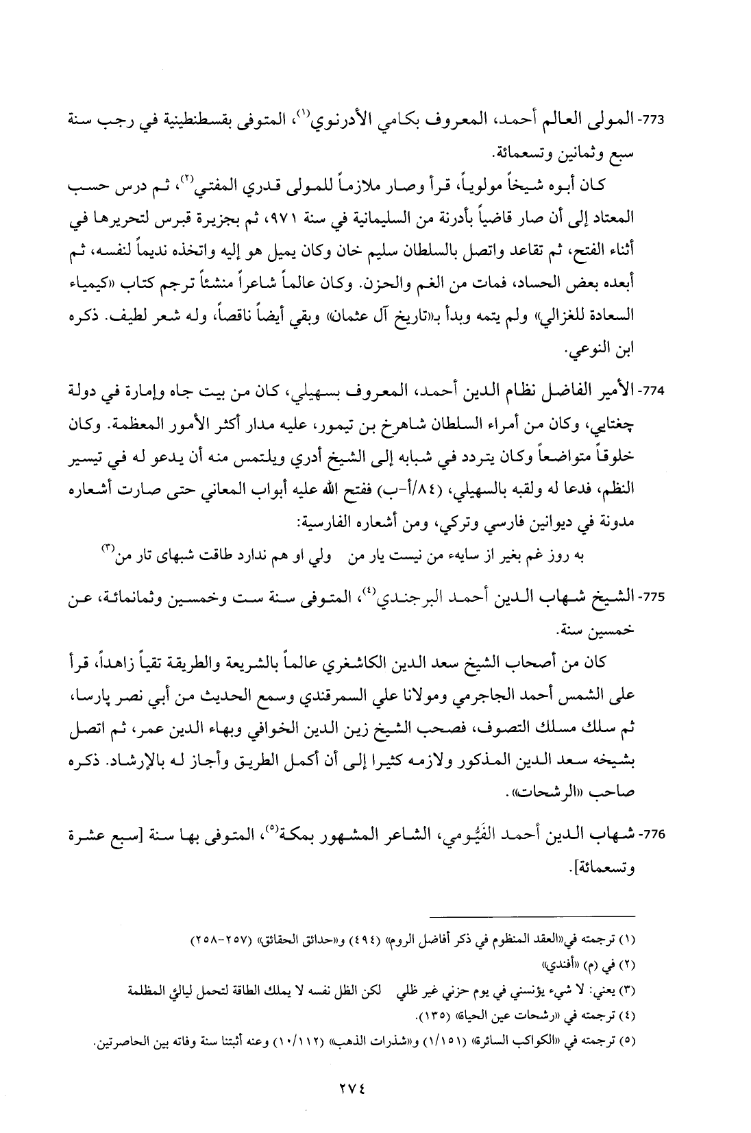 773 - المولى العالم أحمد، المعروف بكامي الأدرنوي (¬1)، المتوفى بقسطنطينية في رجب سنة سبع وثمانين وتسعمائة.