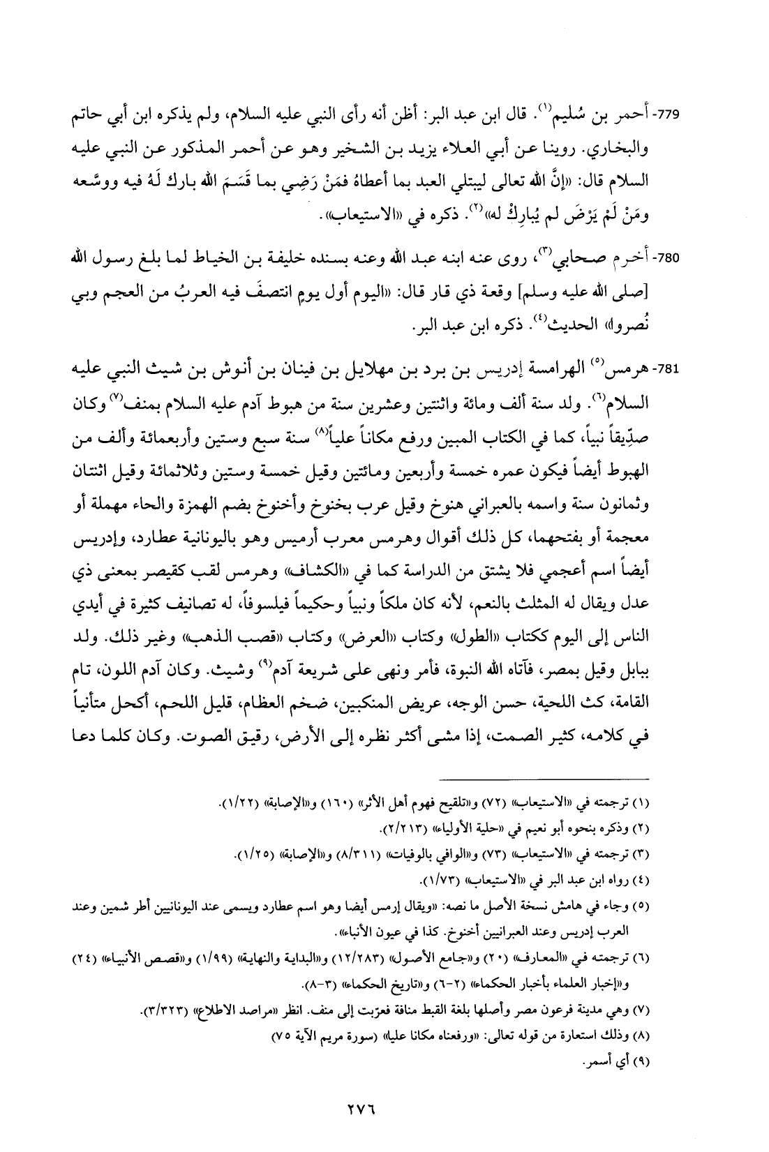 781 - هرمس (¬5) الهرامسة إدريس بن برد بن مهلايل بن فينان بن أنوش بن شيث النبي -عليه السلام- (¬6). ولد سنة ألف ومائة واثنتين وعشرين سنة من هبوط آدم -عليه السلام- بمنف (¬7) وكان صدِّيقًا نبيًا، كما في الكتاب المبين ورفع مكانًا عليًا (¬8) سنة سبع وستين وأربعمائة وألف من الهبوط أيضًا فيكون عمره خمسة وأربعين ومائتين وقيل خمسة وستين وثلاثمائة وقيل اثنتان وثمانون سنة واسمه بالعبراني هنوخ وقيل عرب بخنوخ وأخنوخ بضم الهمزة والحاء مهملة أو معجمة أو بفتحهما، كل ذلك أقوال وهرمس معرب أرميس وهو باليونانية عطارد، وإدريس أيضًا اسم أعجمي فلا يشتق من الدراسة كما في "الكشاف" وهرمس لقب كقيصر بمعنى ذي عدل ويقال له المثلث بالنعم, لأنه كان ملكًا ونبيًا وحكيمًا فيلسوفًا، له تصانيف كثيرة في أيدي الناس إلى اليوم ككتاب "الطول" وكتاب "العرض" وكتاب "قصب الذهب" وغير ذلك. ولد ببابل وقيل بمصر، فآتاه الله النبوة، فأمر ونهى على شريعة آدم (¬9) وشيث. وكان آدم اللون، تام القامة، كث اللحية، حسن الوجه، عريض المنكبين، ضخم العظام، قليل اللحم، أكحل متأنيًا في كلامه، كثير الصمت, إذا مشى أكثر نظره إلى الأرض، رقيق الصوت. وكان كما دعا