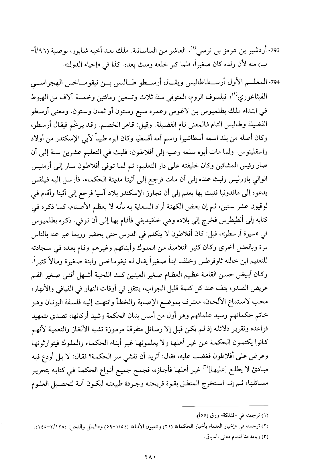794 - المعلم الأول أرسطاطاليس ويقال أرسطو طاليس بن نيقوماخس الهجراسي الفيثاغوري (¬2)، فيلسوف الروم، المتوفى سنة ثلاث وتسعين ومائتين وخمسة آلاف من الهبوط في ابتداء ملك بطلميوس بن لاغوس وعمره سبع وستون أو ثمان وستون. ومعنى أرسطو الفضيلة وطاليس التام فالمعنى تام الفضيلة. وقيل: قاهر الخصم. وقد يرخَّم فيقال أرسطو، وكان أصله من بلد اسمه أسطاشيرا واسم أمه أقسطيا وكان أبوه طبيبًا لأبي الإسكندر من أولاد راسقلينوس. ولما مات أبوه سلمة وصيه إلى أفلاطون، فلبث في التعليم عشرين سنة إلى أن صار رئيس المشائين وكان خليفته على دار التعليم، ثم لما توفي أفلاطون سار إلى أرمنيس الوالي باورليس ولبث عنده إلى أن مات فرجع إلى أثينا مدينة الحكماء، فأرسل إليه فيلقس يدعوه إلى ماقدونيا فلبث بها يعلم إلى أن تجاوز الإسكندر بلاد آسيا فرجع إلى أثينا وأقام في لوقيون عشر سنين، ثم إن بعض الكهنة أراد السعاية به بأنه لا يعظم الأصنام، كما ذكره في كتابه إلى أنطيطرس فخرج إلى بلاده وهي خلقيديقي فأقام بها إلى أن توفي. ذكره بطلميوس في "سيرة أرسطو"، قيل: كان أفلاطون لا يتكلم في الدرس حتى يحضر وربما عبر عنه بالناس مرة وبالعقل أخرى وكان كثير التلاميذ من الملوك وأبنائهم وغيرهم وقام بعده في سجادته للتعليم ابن خالته ثاوفرطس وخلف ابنًا صغيرًا يقال له نيقوماخس وابنة صغيرة ومالًا كثيرًا. وكان أبيض حسن القامة عظيم العظام صغير العينين كث اللحية أشهل أقنى صغير الفم عريض الصدر، يقف عند كل كلمة قليل الجواب، ينتقل في أوقات النهار في الفيافي والأنهار، محب لاستماع الألحان، معترف بموضع الإصابة والخطأ وانتهت إليه فلسفة اليونان وهو خاتم حكمائهم وسيد علمائهم وهو أول من أسس بنيان الحكمة وشيد أركانها، تصدى لتمهيد قواعده وتقرير دلائله إذ لم يكن قبل إلا رسائل متفرقة مرموزة تشبه الألغاز والتعمية لأنهم كانوا يكتمون الحكمة عن غير أهلها ولا يعلمونها غير أبناء الحكماء والملوك فيتوارثونها وعرض على أفلاطون فغضب عليه، فقال: أتريد أن تفشي سر الحكمة؟ فقال: لا بل أودع فيه مبادئ لا يطلع [عليها] (¬3) غير أهلها فأجازه، فجمع جميع أنواع الحكمة في كتابه بتحرير مسائلها، ثم إنه استخرج المنطق بقوة قريحته وجودة طبيعته ليكون آلة لتحصيل العلوم