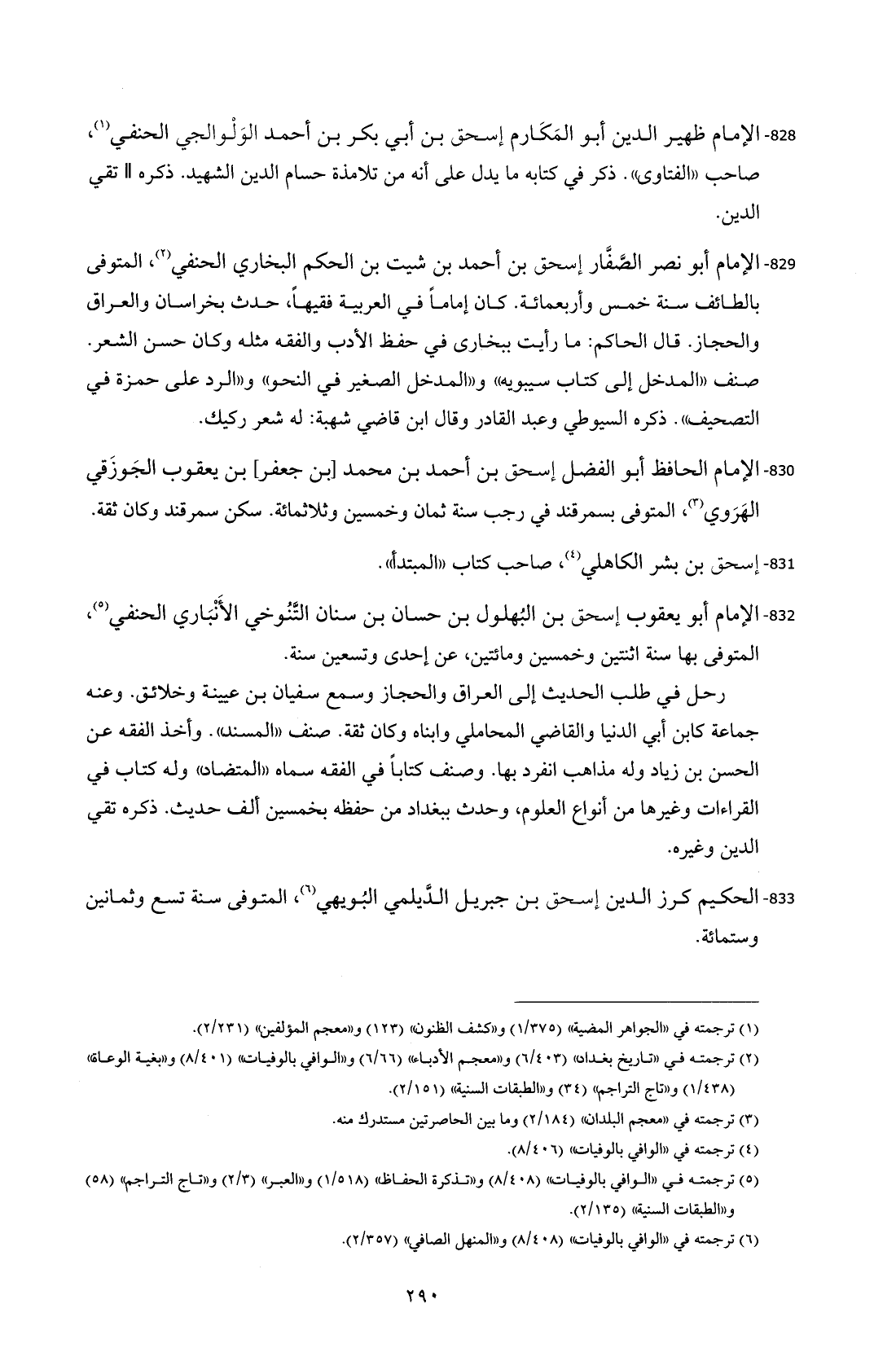 832 - الإمام أبو يعقوب إسحاق بن البُهلول بن حسان بن سنان التَّنُوخي الأَنْبَاري الحنفي (¬5)، المتوفى بها سنة اثنتين وخمسين ومائتين، عن إحدى وتسعين سنة.